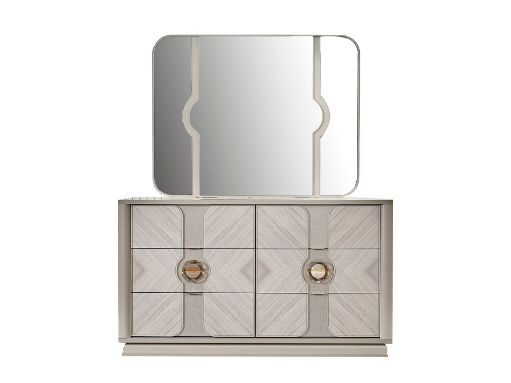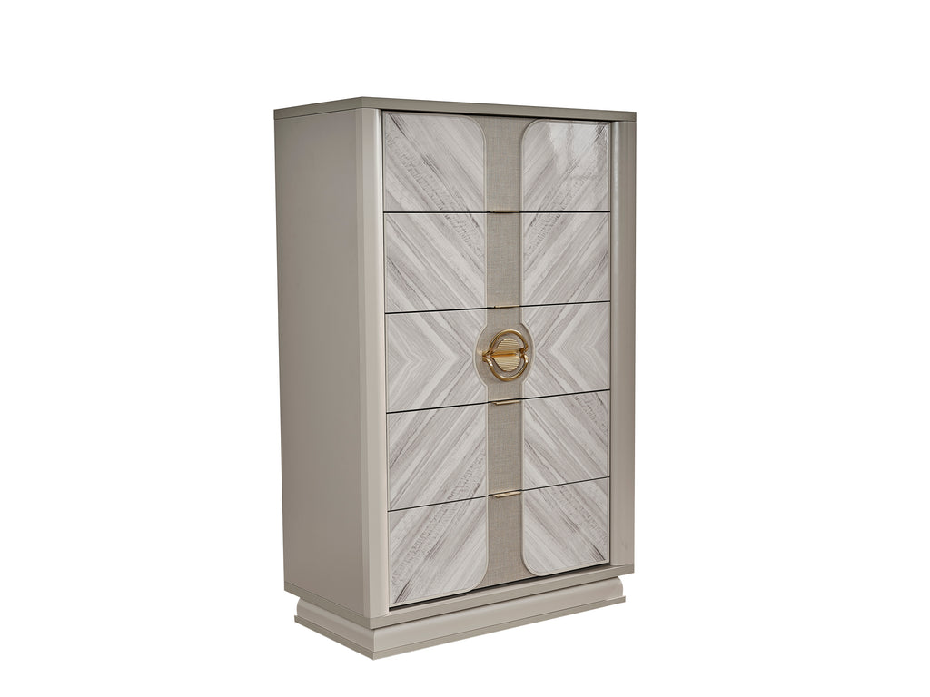 Transform your bedroom into a luxurious retreat with this exquisite bedroom set, available in both 4-piece and 5-piece configurations to perfectly suit your space. The set showcases a refined Eucalyptus-veneer finish throughout, accentuated by a high gloss lacquer that exudes elegance and sophistication. Each piece is thoughtfully designed with modern chrome accents, bringing a contemporary edge to the classic aesthetic. Additionally, the dresser and nightstand include soft-closing drawers, ensuring a smooth and quiet experience. Whether you choose the 4-piece set, including a bed, dresser, mirror, and nightstand, or the 5-piece set with the addition of a chest, this collection offers both style and functionality, making it an ideal centerpiece for your bedroom.