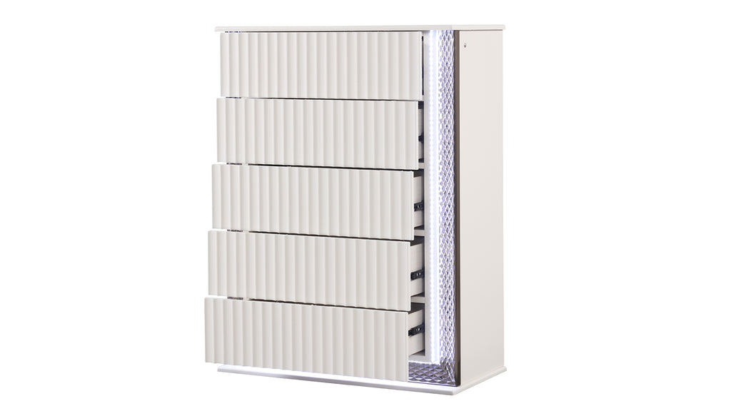 This contemporary chest combines modern design with functional storage, making it an ideal addition to any bedroom. Its textured front adds visual depth and style, while diamond-patterned side accents offer a refined, elegant touch. Integrated LED lighting along the side panels casts a soft, ambient glow that enhances its unique details. With multiple drawers, it provides ample space for organizing clothes and linens, and the top drawer is lined with rich red velvet—perfect for storing delicate items. Crafted from a blend of solid and manufactured wood, this chest offers both lasting durability and sophisticated style.