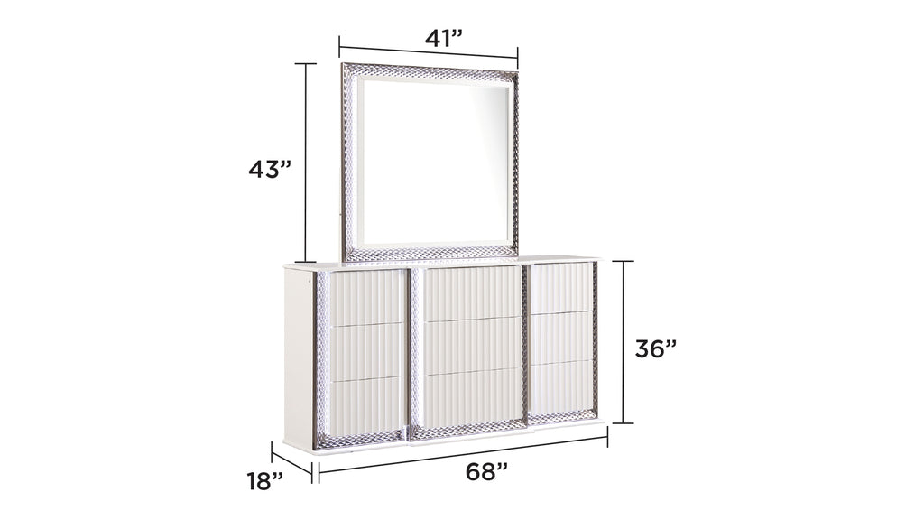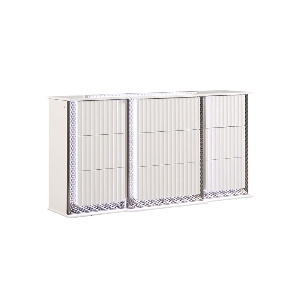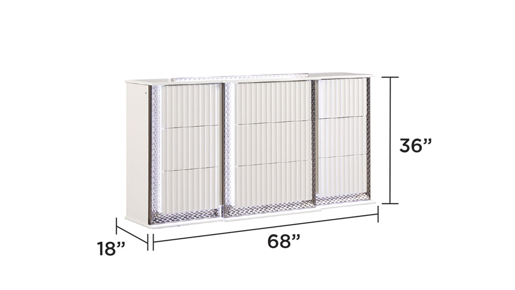 This sophisticated dresser blends modern design with practical functionality, making it a perfect addition to any bedroom. Its sleek exterior features a textured front for added depth and style, while the sides are framed with a distinctive diamond-patterned design and integrated LED lighting that emits a soft, inviting glow. Offering generous storage with multiple drawers, it provides ample space to keep clothing, linens, and essentials neatly organized. The top three drawers are lined with rich red velvet, adding a luxurious touch for storing delicate items. Crafted from a combination of solid and manufactured wood, this dresser delivers both durability and lasting style.