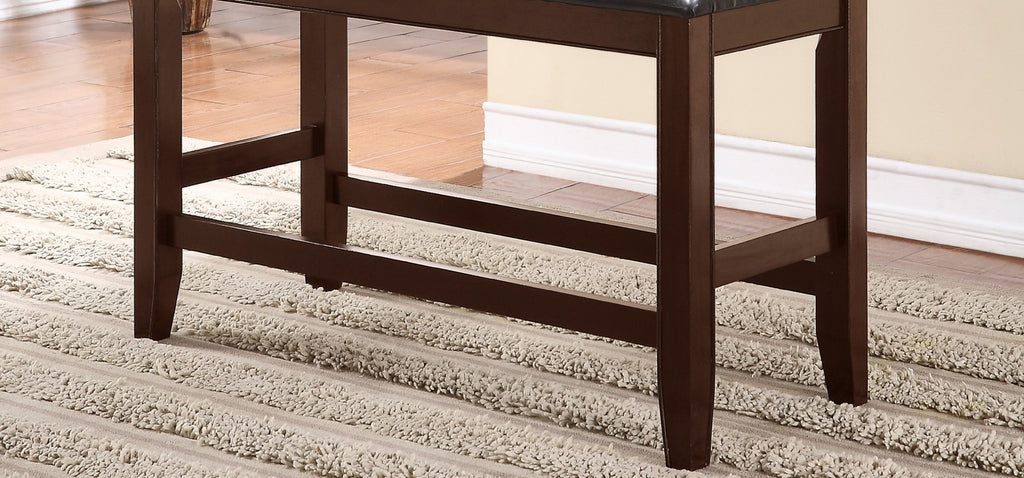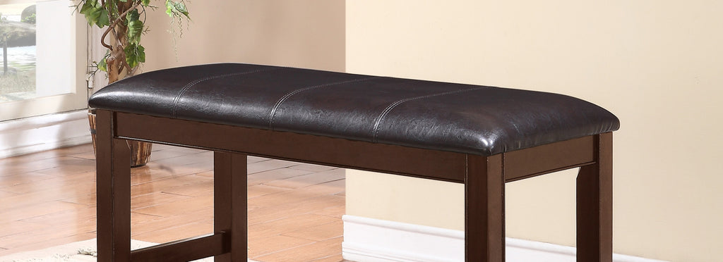 Product Description: This counter height Bench offers a sleek contemporary style which would be perfect for your modern day dining area. It features a faux leather upholstered seat with accent stitching and a dark brown finish. Can be paired with the counter height dining Table and Stools.
