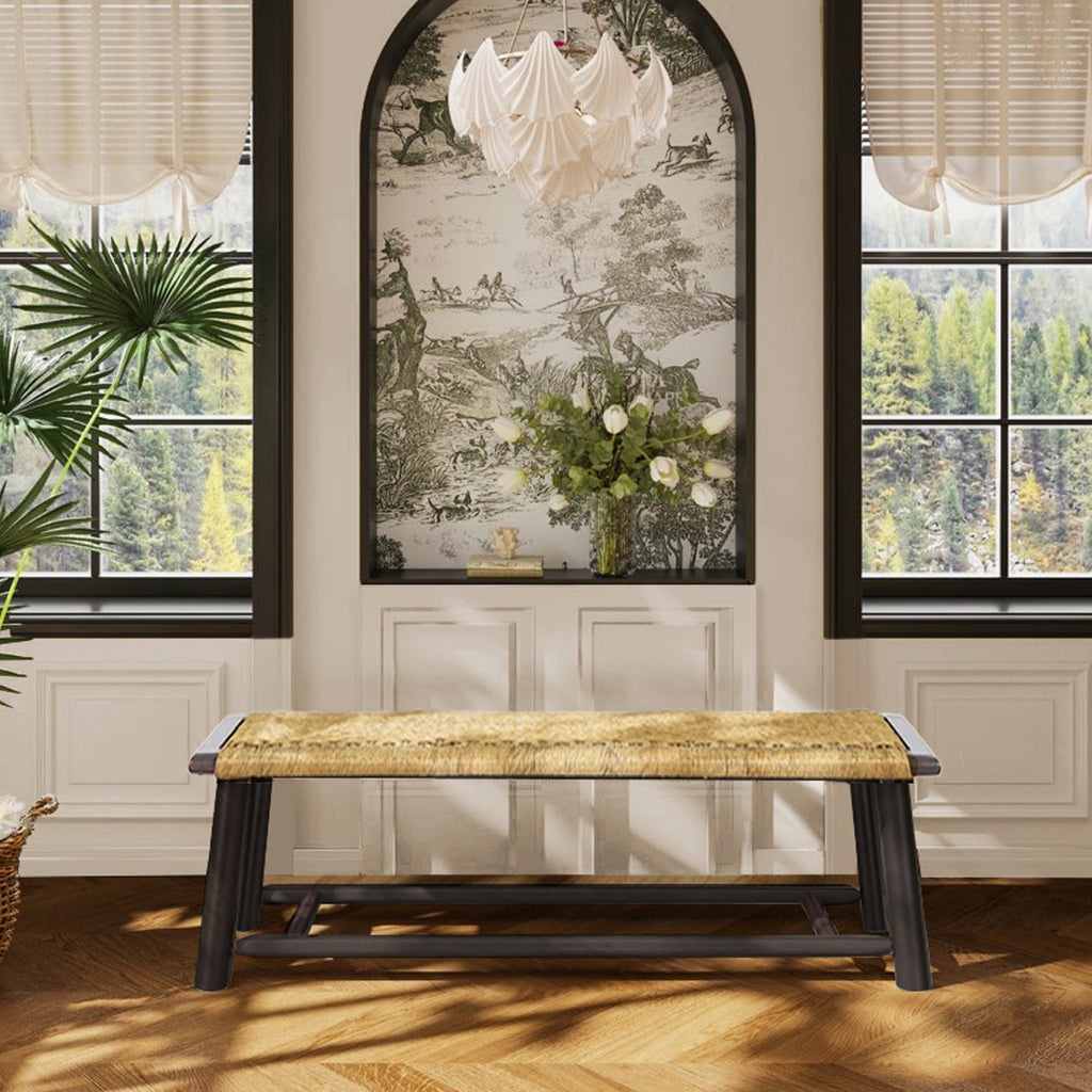 - Designed for breezy porches, sunrooms, or cozy dining nooks. This bench blends handwoven rattan seating with tapered solid wood legs, offering a farmhouse-modern aesthetic adaptable to covered patios or airy living spaces.