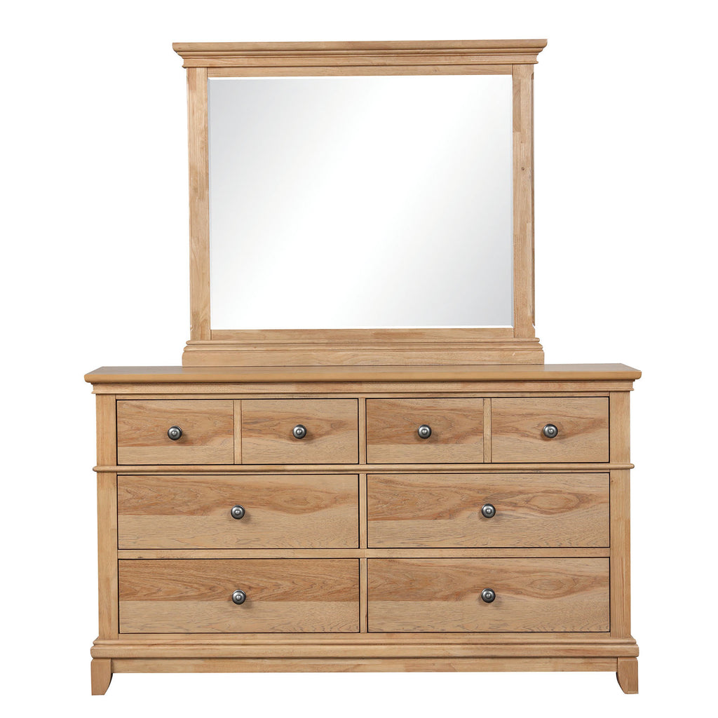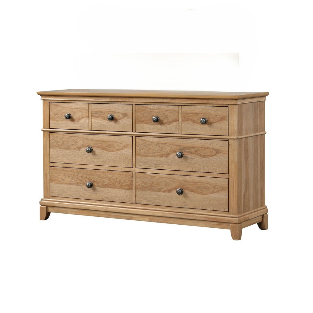 Farmhouse-style bedroom dresser with a felt‑lined top drawer, dovetail construction (French front and English back), and metal side glides. Made from rubberwood, engineered wood, solid wood, and pecan veneer.