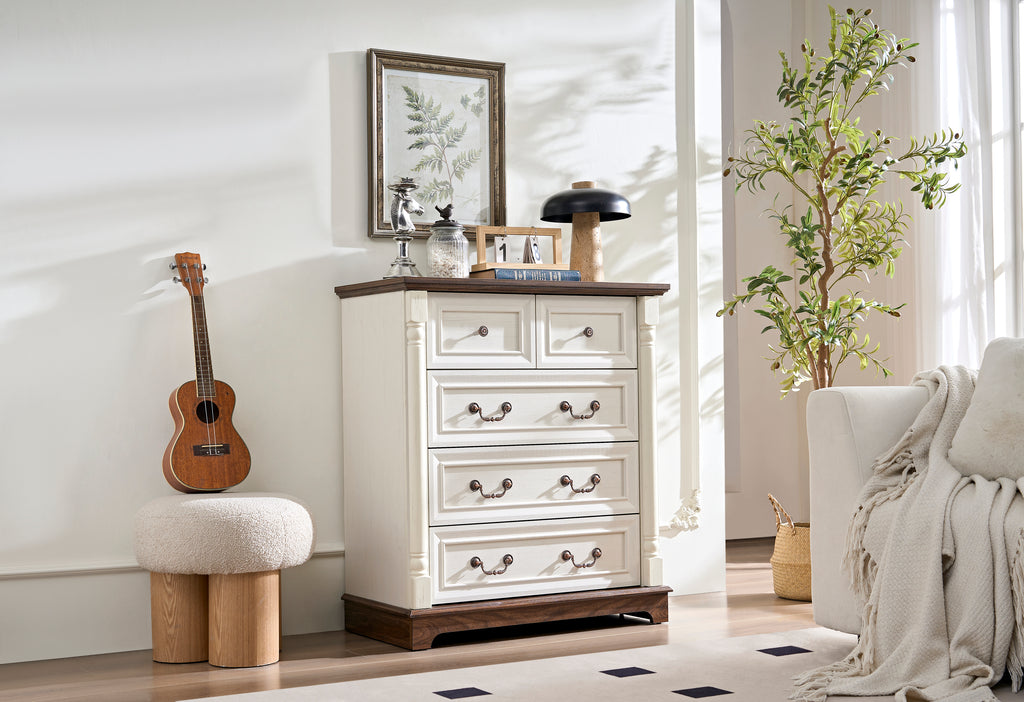 - With 5 smooth-gliding drawers, this 5-drawer dresser adds storage space to your home for clothing, extra blankets or pillows. This charming dresser complements any lover of shabby chic inspiration