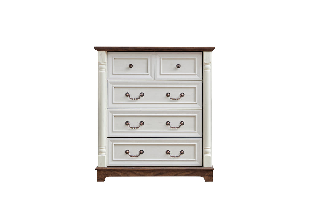 - Bring warmth to your bedroom/living room with this 5-drawer dresser featuring an antique two-tone finish texture that stands out against the dimpled finish. Wooden base and solid wood columns adorn the piece for a beautiful look. Pair with unique antique tone pulls for years of satisfaction. Pair with the entire bedroom furniture collection