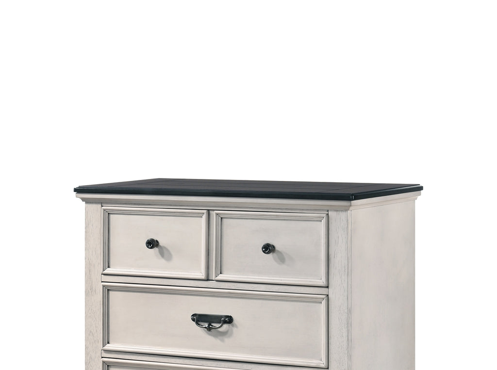 Description:- This dresser features detailed molding and vintage-inspired metal hardware, offering a luxurious additional to any bedroom. The gentle antique white palette is soothing to the eye, making the piece a perfect choice for creating a serene and sophisticated bedroom oasis. Adorned with black nickel hardware, this chest of drawers will perfectly adorn your room alongside any of the other matching pieces..