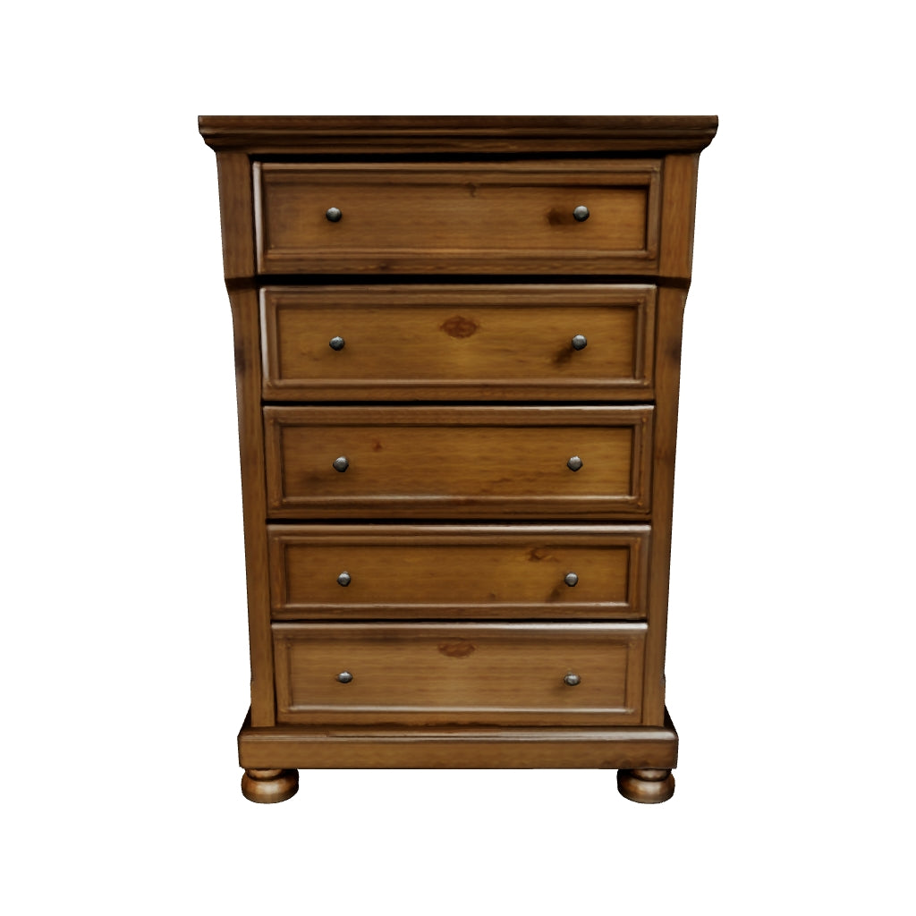 A relaxed take on casual traditional design, this chest of drawers strikes a comfy pose with a classic sensibility. Its timeless design and chestnut brown wood-tone create a welcoming retreat tailored to your laid-back lifestyle. Metal knobs in an aged pewter color subtly dress up drawers packed with storage possibilities.