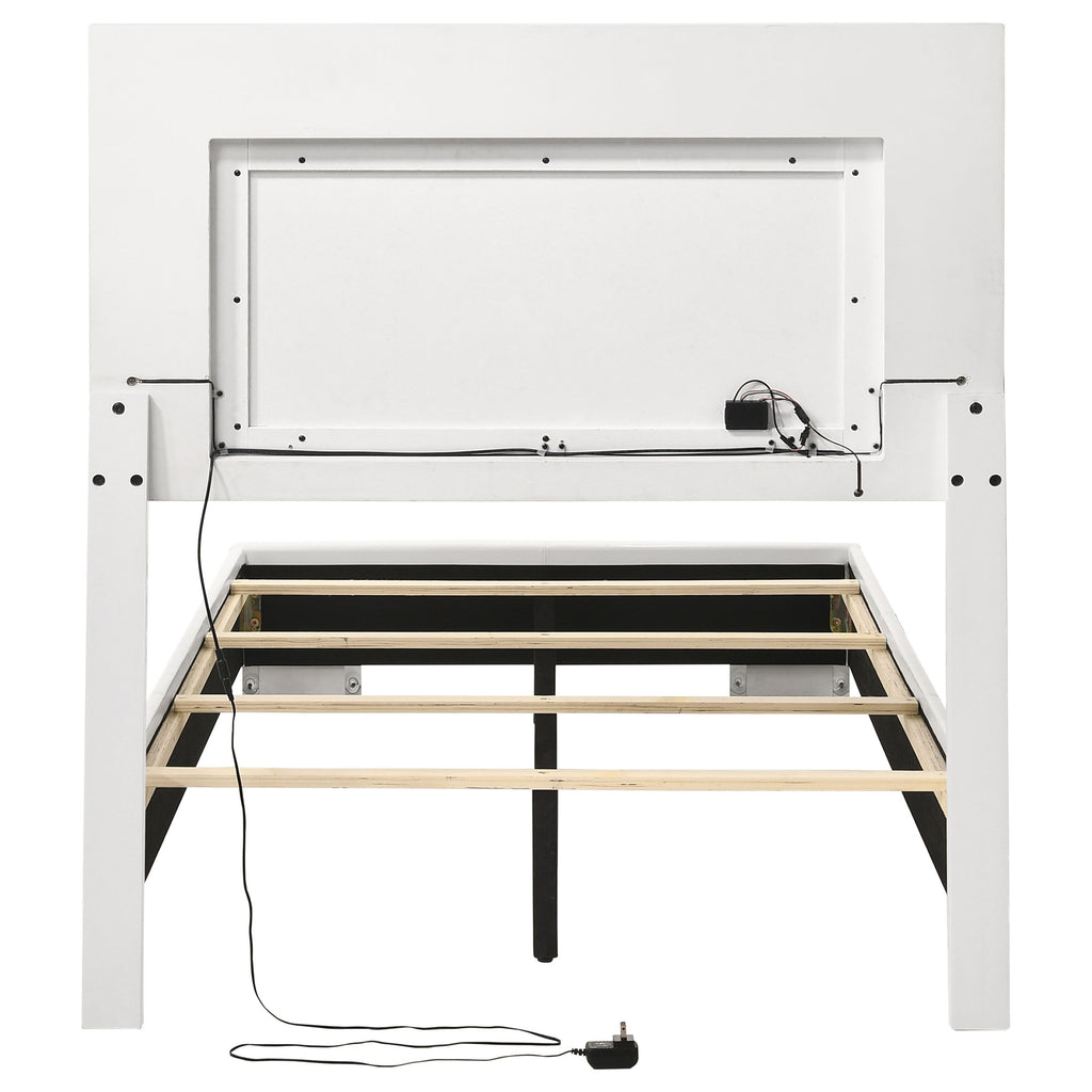 The white high-gloss finish brings a sleek, modern look that reflects light for a bright and polished bedroom atmosphere. Equipped with built-in LED panel lighting, slat detailing for strong support, and four sturdy legs, this bed combines contemporary style with lasting durability.