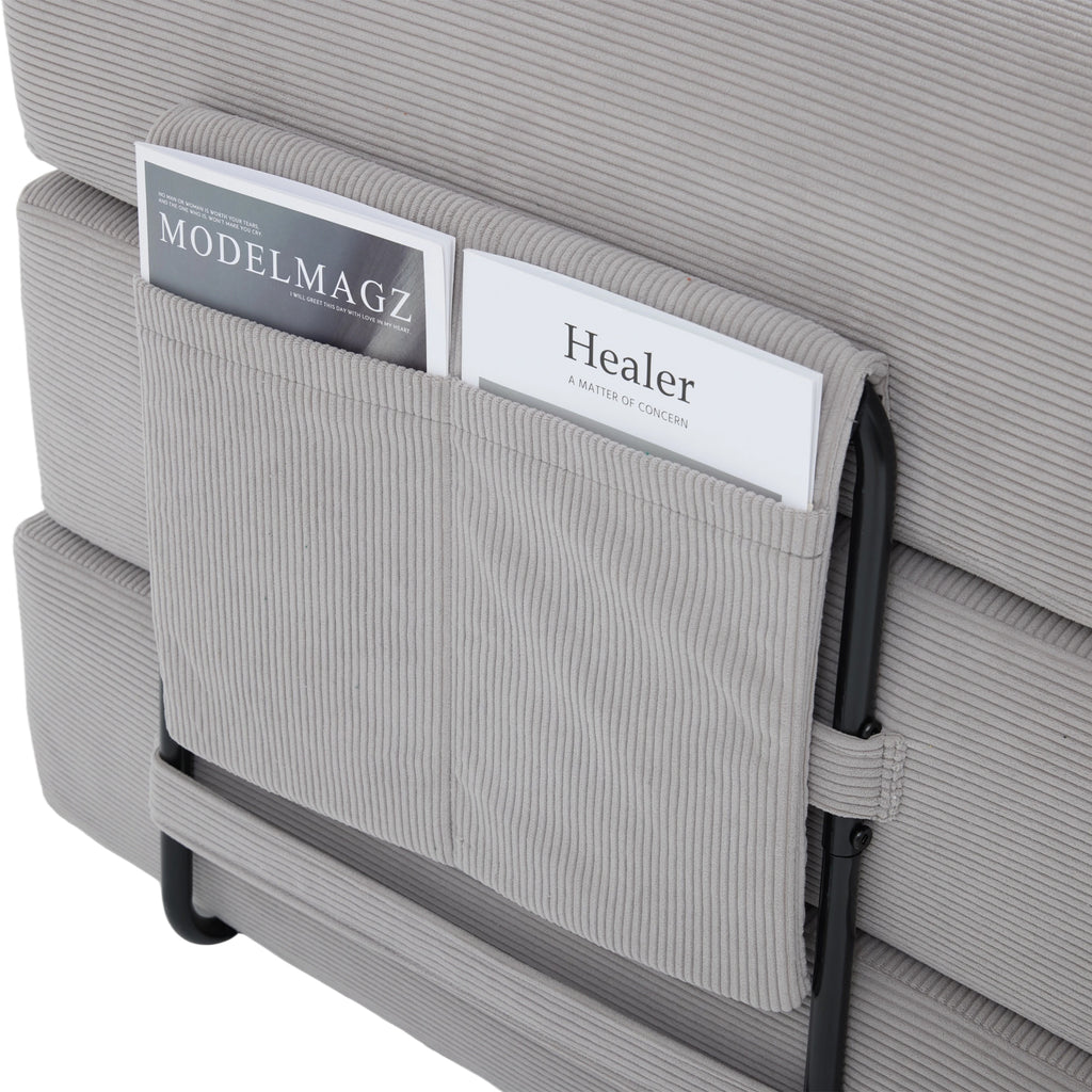 - A storage pocket is attached to the frame, keeping magazines, remote controls, or tablets within easy reach. This keeps your living area tidy and functional.