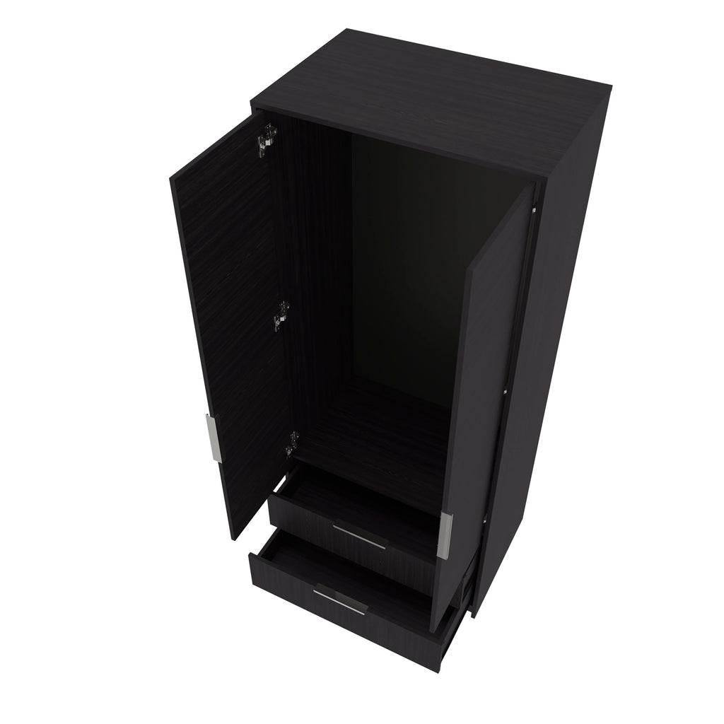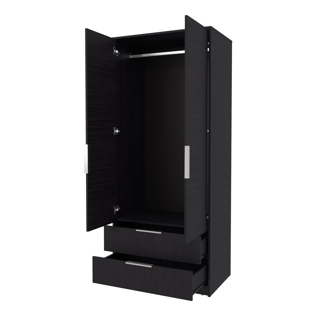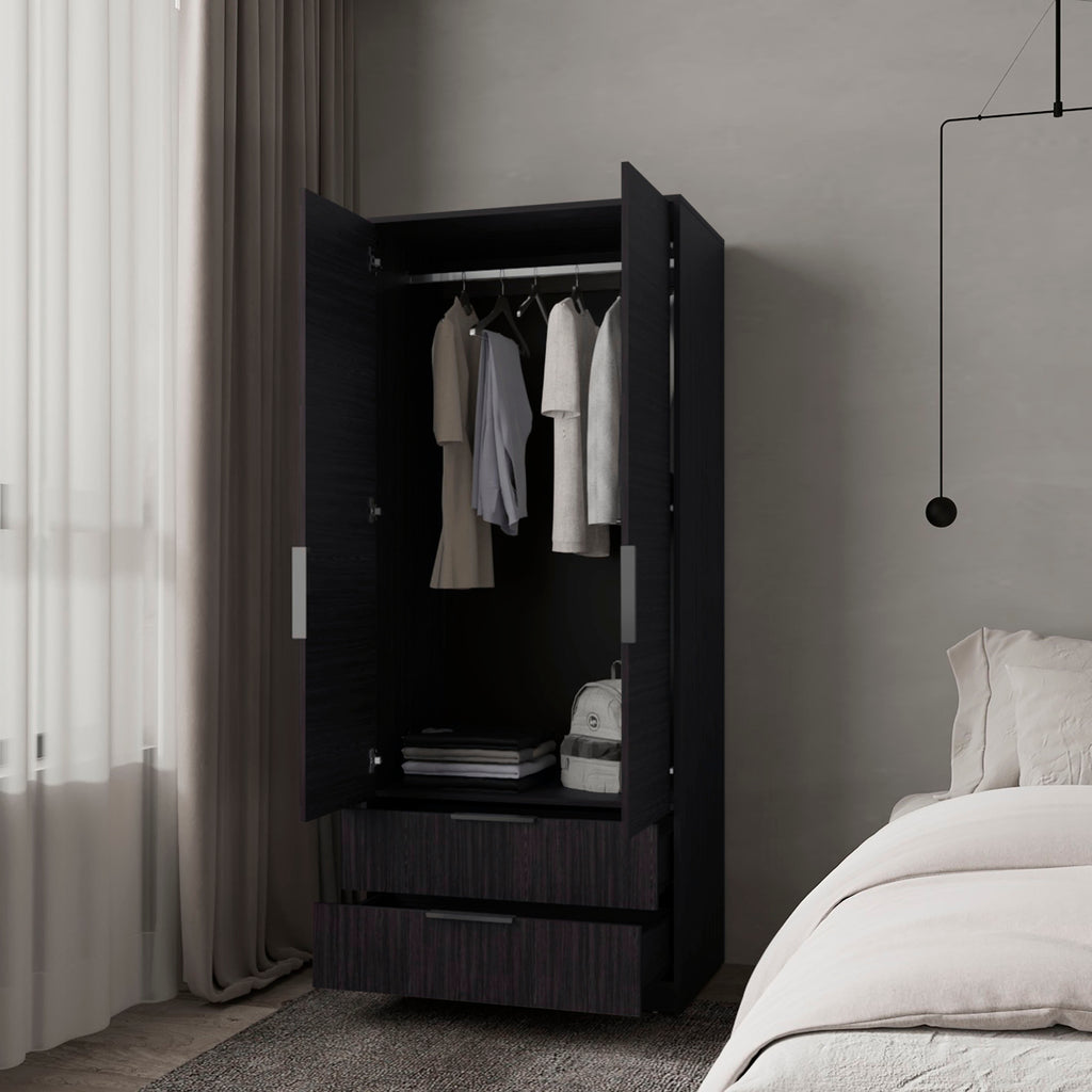 'Keep your clothes and accessories perfectly organized with this practical and modern wardrobe. It features two hinged doors that protect your garments, a top hanging rod for jackets, shirts, or dresses, and two spacious lower drawers ideal for folded clothes, shoes, or accessories. Its compact design makes it perfect for bedrooms of any size, optimizing space without sacrificing storage capacity. The metal handles add a contemporary touch, while its sleek finish easily fits into various décor styles.