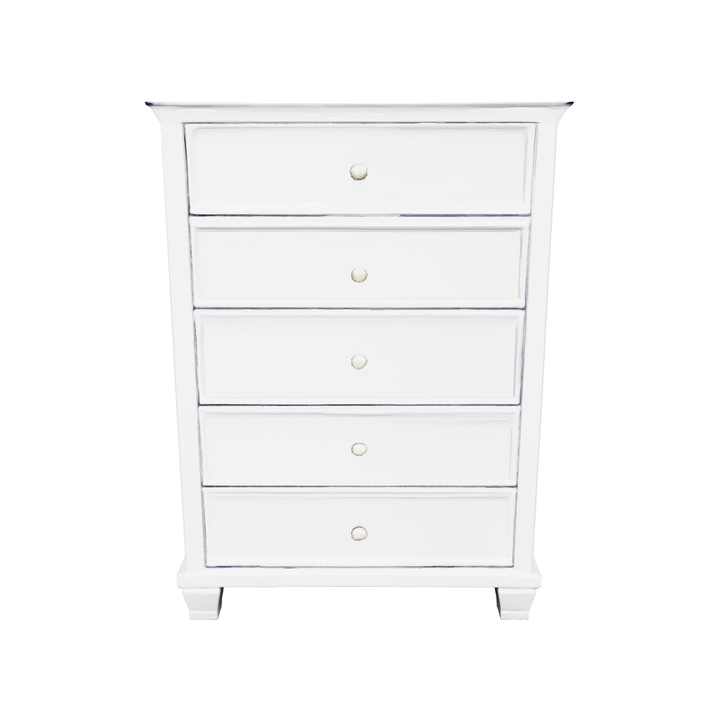 Exuding a timeless casual design, this chest of drawers is ready to define your personal space. It easily adapts to a variety of interiors, combining a clean, contemporary white finish with framed drawer fronts and round metal knobs. Featuring five storage drawers with dovetail construction and traditional tapered feet, this piece is sure to bring elegant simplicity to your bedroom.