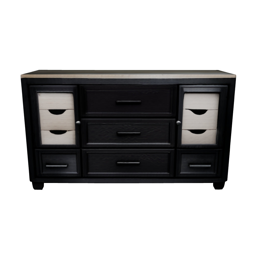 This dresser is casual contemporary style simply done right. Its two-tone color scheme features a rich brushed main color accented with a beautiful dusty wood tone. With 11 soft-close drawers (three located neatly behind each door) this dresser offers plenty of storage to accommodate your wardrobe needs with ease.