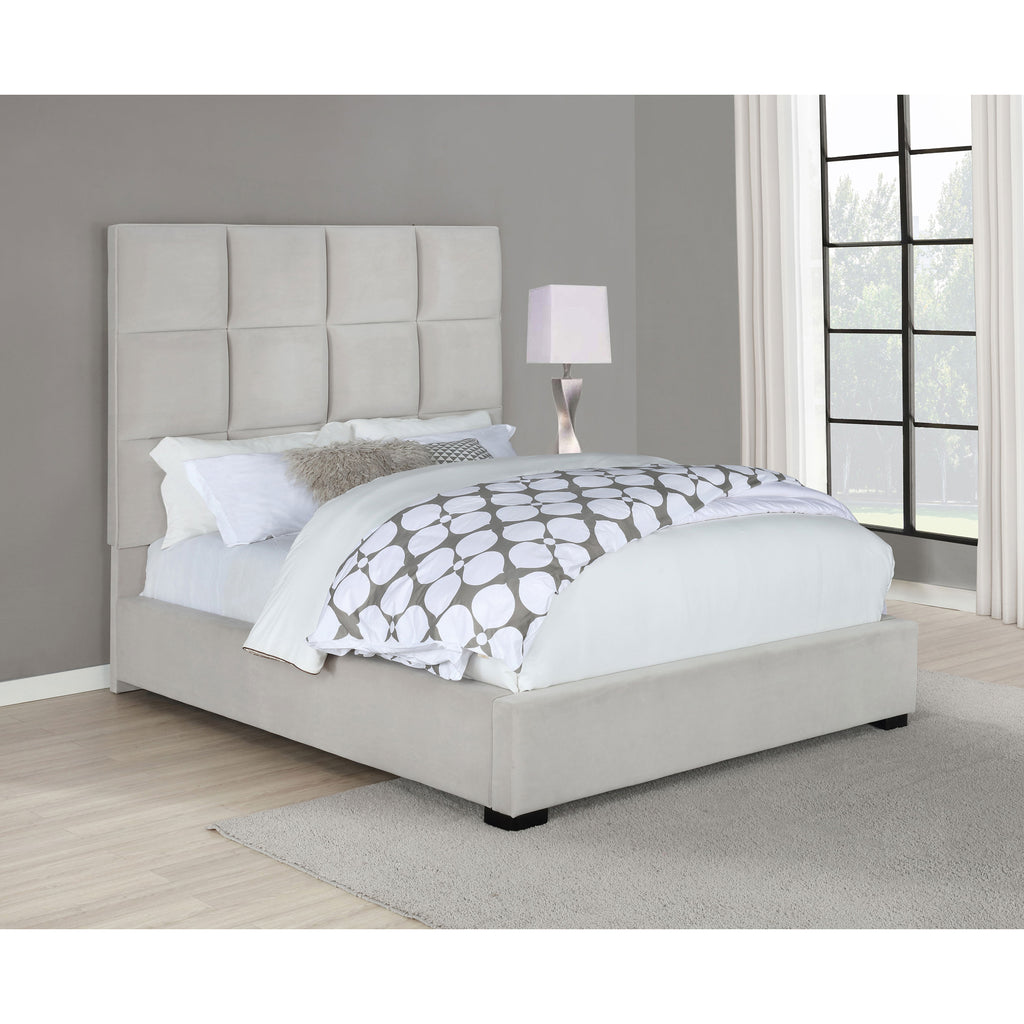 Plush, padded panels are arranged into a modern grid design in this upholstered wooden bed. Perfect for creating a sophisticated bedroom environment, this bed is wrapped in rich velvet upholstery for a touch of comfortable luxury.