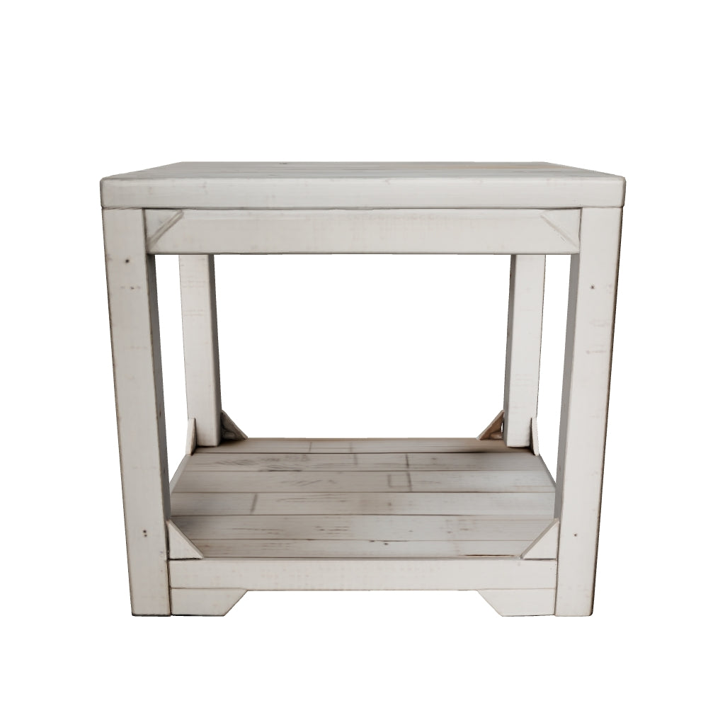 Take in the country fresh look of this end table and connect with a simpler time. Its farmhouse style is evident in its stocky design with planked top/bottom shelf, unique triangle accents and relaxed white washed finish. With a handcrafted look thanks to reclaimed wood, you'll love the casual feel this piece brings to your living area.