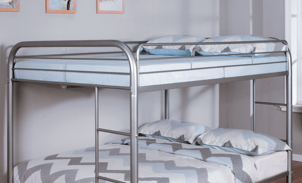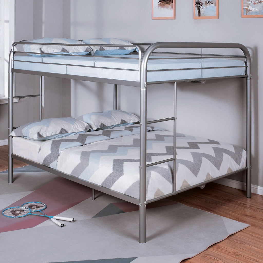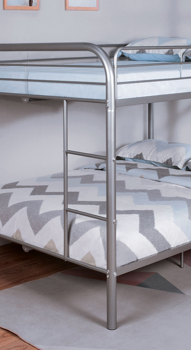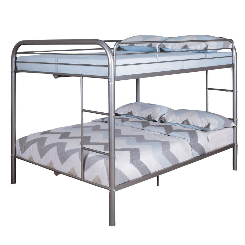 Full-over-Full metal bunk bed in glossy silver finish. It features a sturdy full-metal frame with an integrated side ladder and is ‘mattress-ready' maximizing sleep space in contemporary or youth bedrooms.