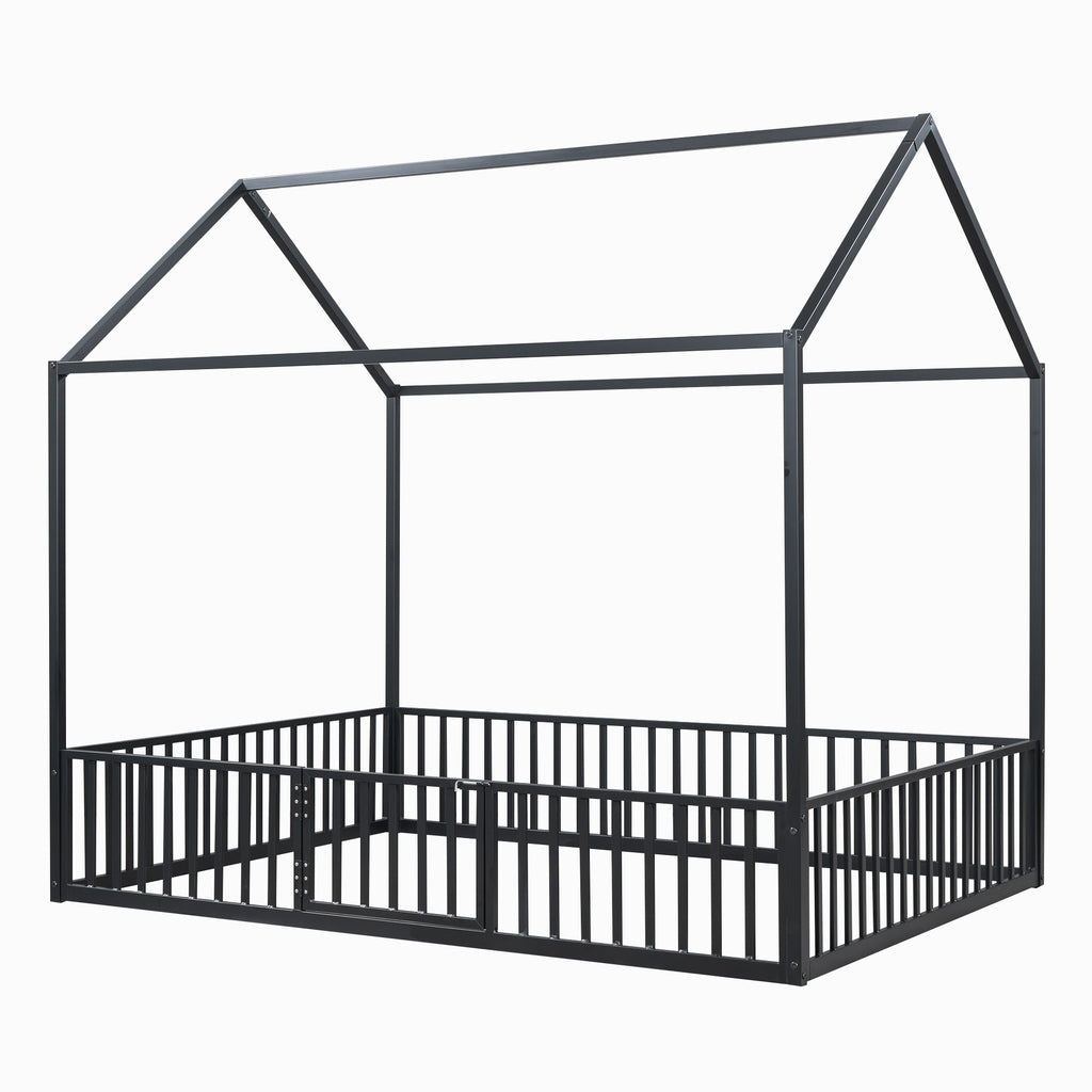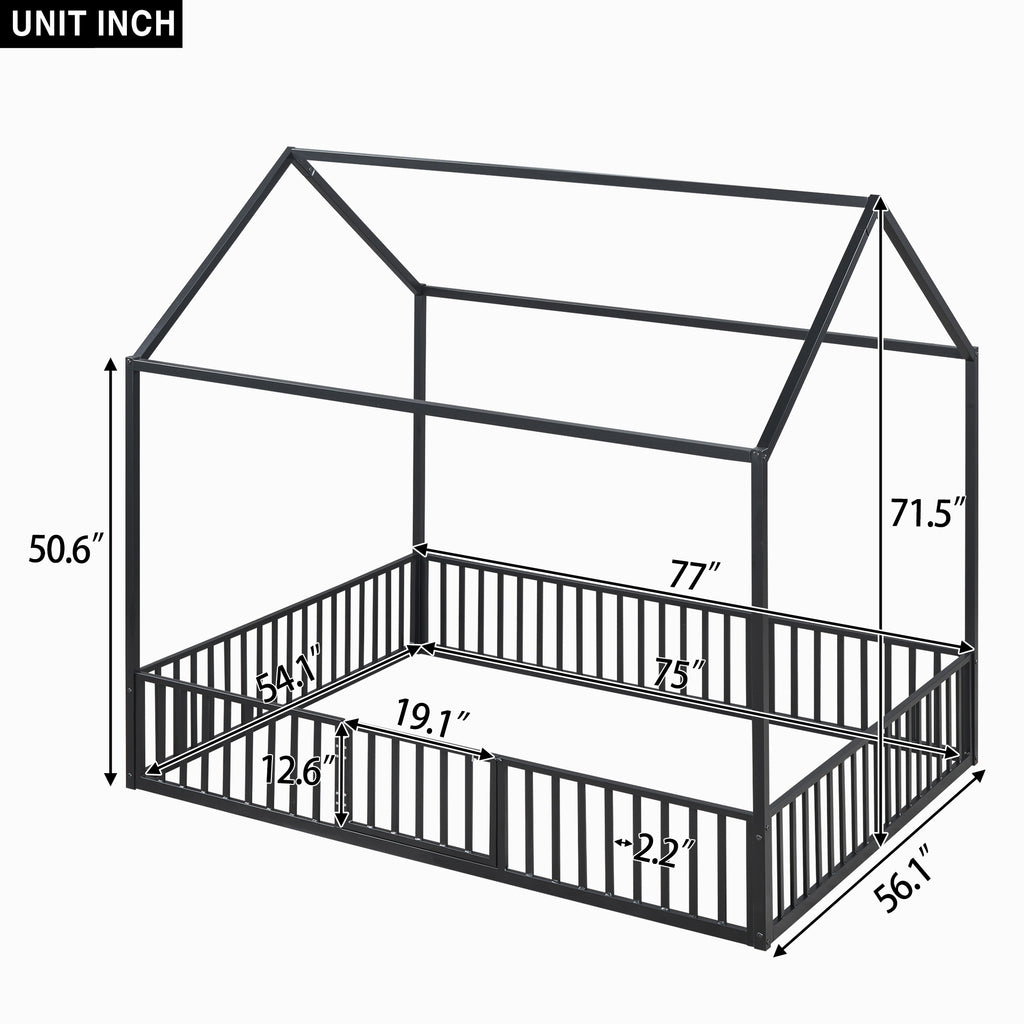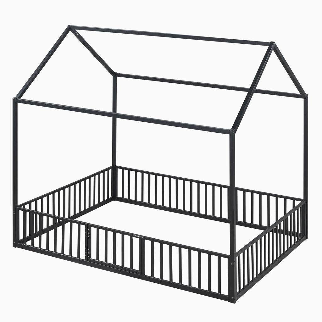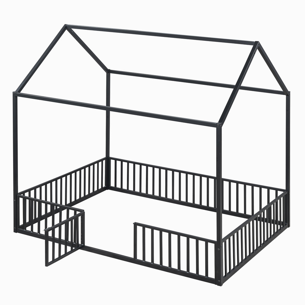 Transform your child's room with this unique full-size metal house bed featuring a whimsical roof, functional fence, and charming door, perfect for inspiring imaginative play. Crafted from durable black metal with a distressed washed finish, this sturdy bed offers exceptional safety and style that complements any decor. Provide a secure and inspiring sleep space where creativity flourishes, making bedtime an adventure every night.