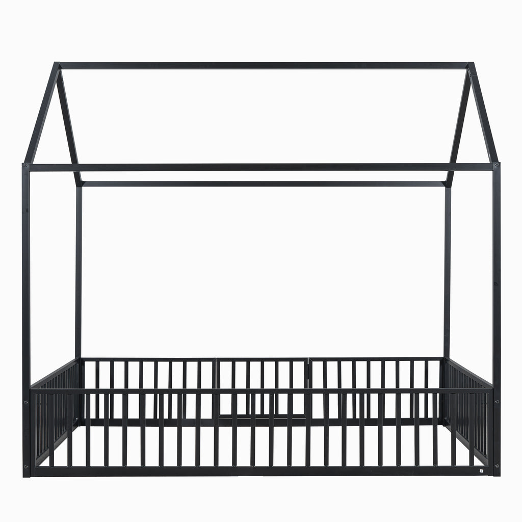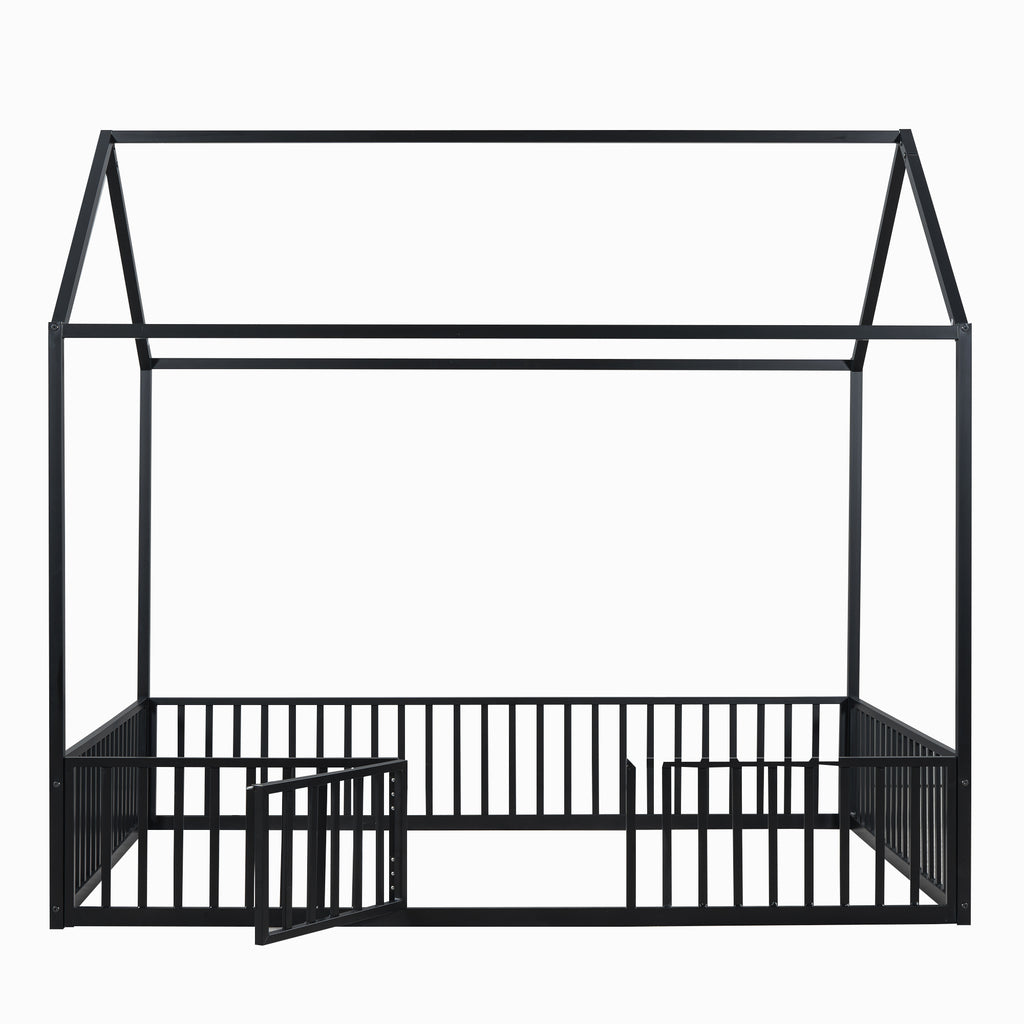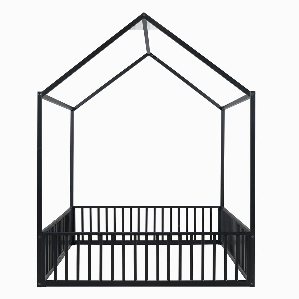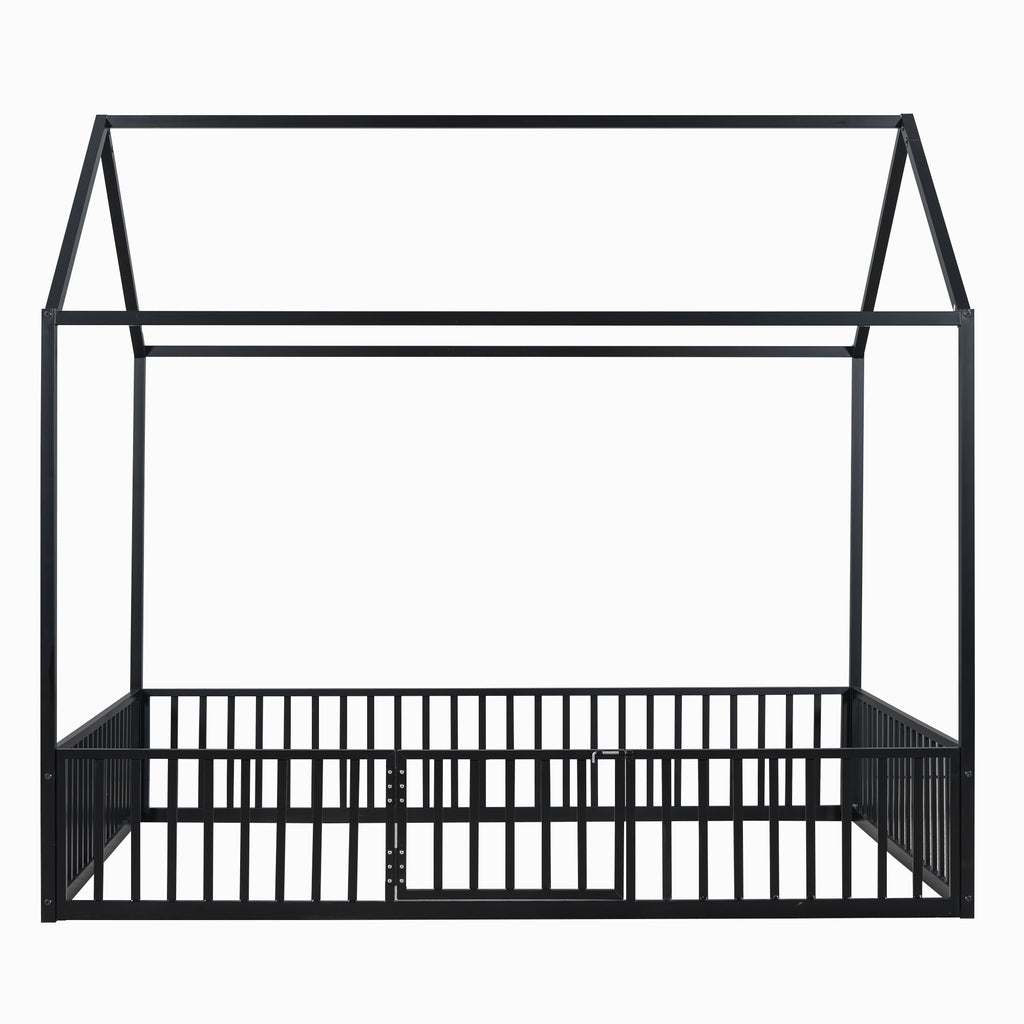 Transform your child's room with this unique full-size metal house bed featuring a whimsical roof, functional fence, and charming door, perfect for inspiring imaginative play. Crafted from durable black metal with a distressed washed finish, this sturdy bed offers exceptional safety and style that complements any decor. Provide a secure and inspiring sleep space where creativity flourishes, making bedtime an adventure every night.
