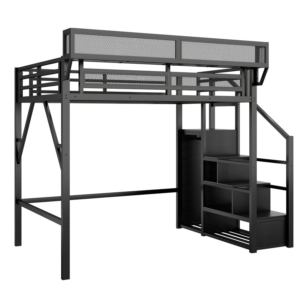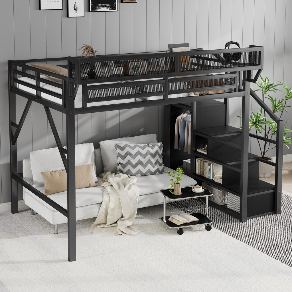 Full Size Loft Bed with Stairs, Metal Full Loft Bed with Storage Shelves, High Loft Bed with