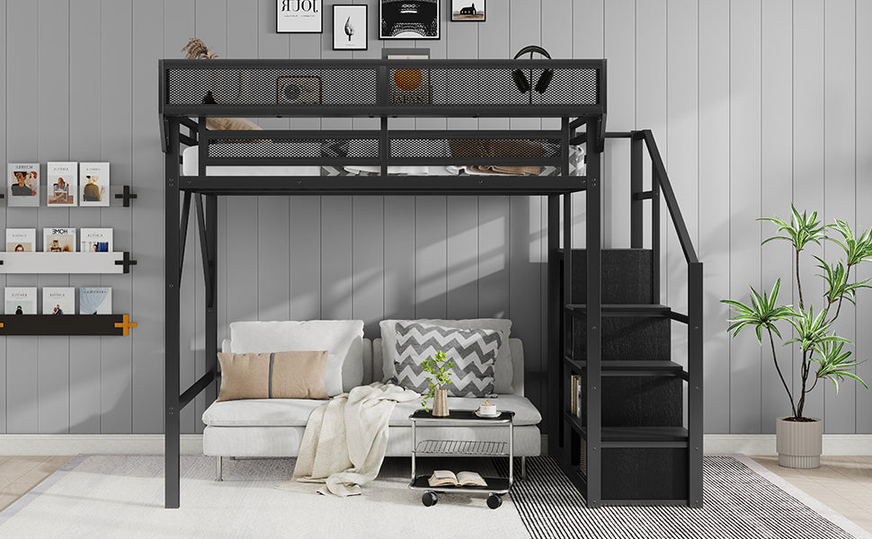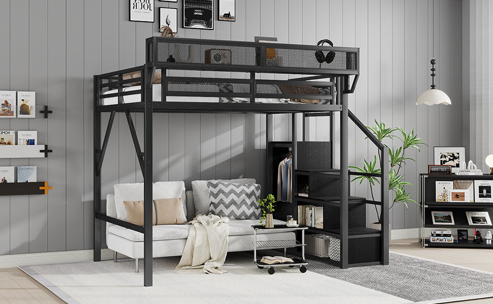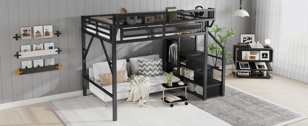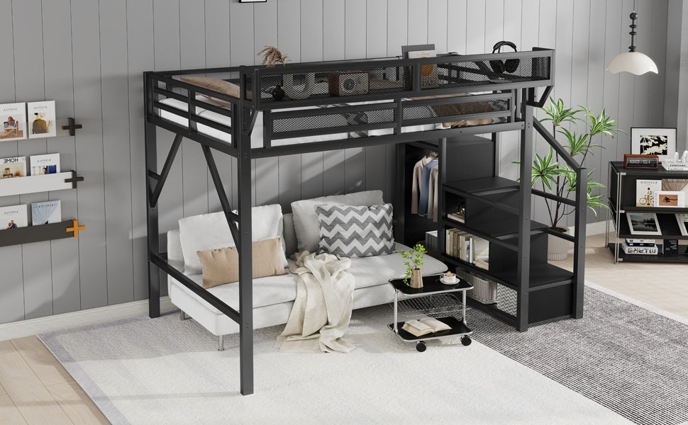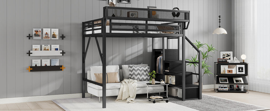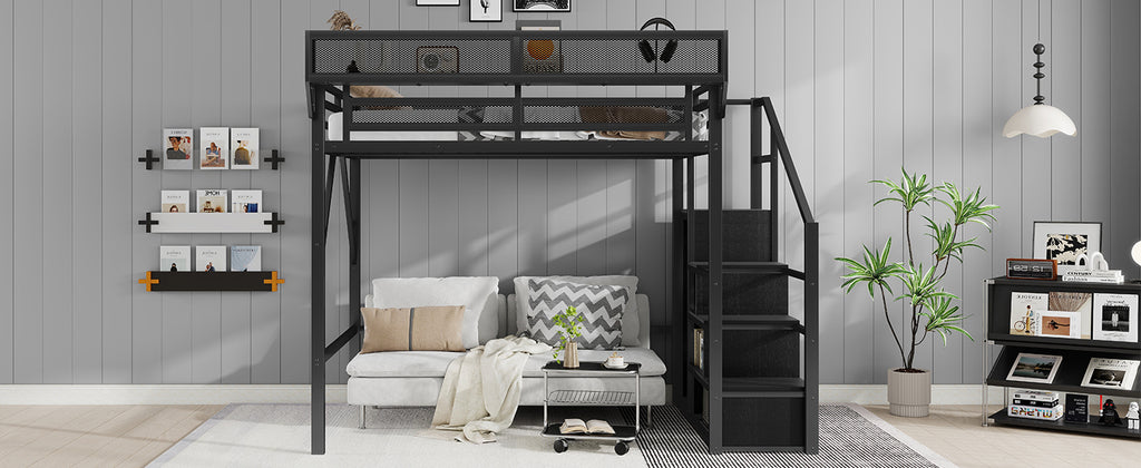- 【Metal Full Loft Bed with Staircase】The metal full size loft bed come with staircase includes built-in storage compartments, making it easy to store items like shoes, toys, or blankets. The steps ensure safe and convenient access to the upper bed, enhancing both practicality and safety. The stairs can be installed on either right side or left side.