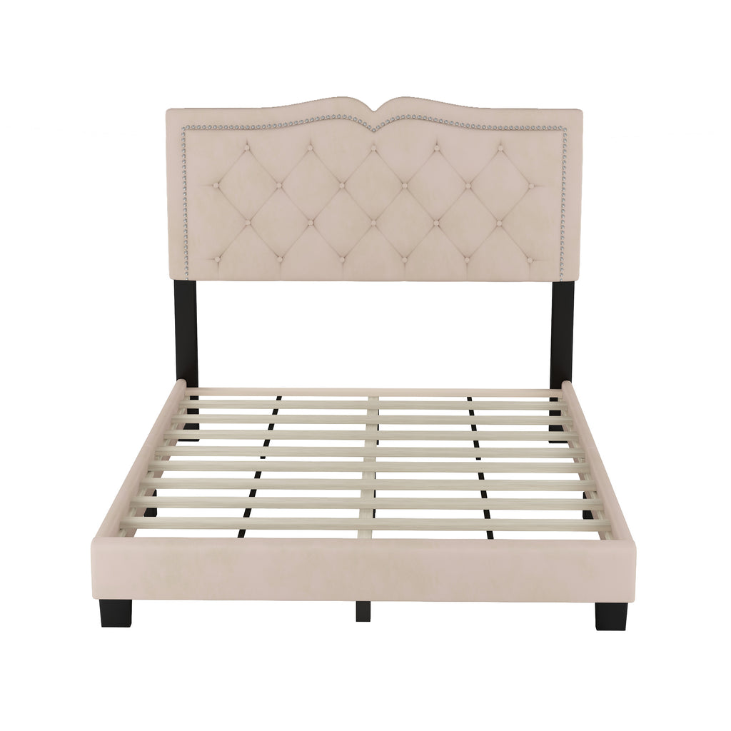 Elevate your bedroom with this exquisite Full Size Velvet Platform Bed, featuring a plush tufted headboard adorned with elegant rivet accents. Its robust MDF and plywood frame ensures superior 500lb support without needing a box spring, thanks to 10 sturdy slats. Experience unparalleled comfort and modern sophistication with this beige upholstered bed, designed for lasting appeal.