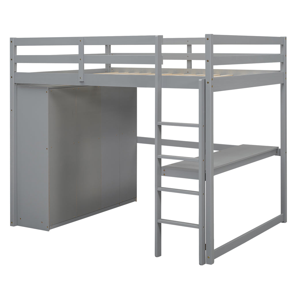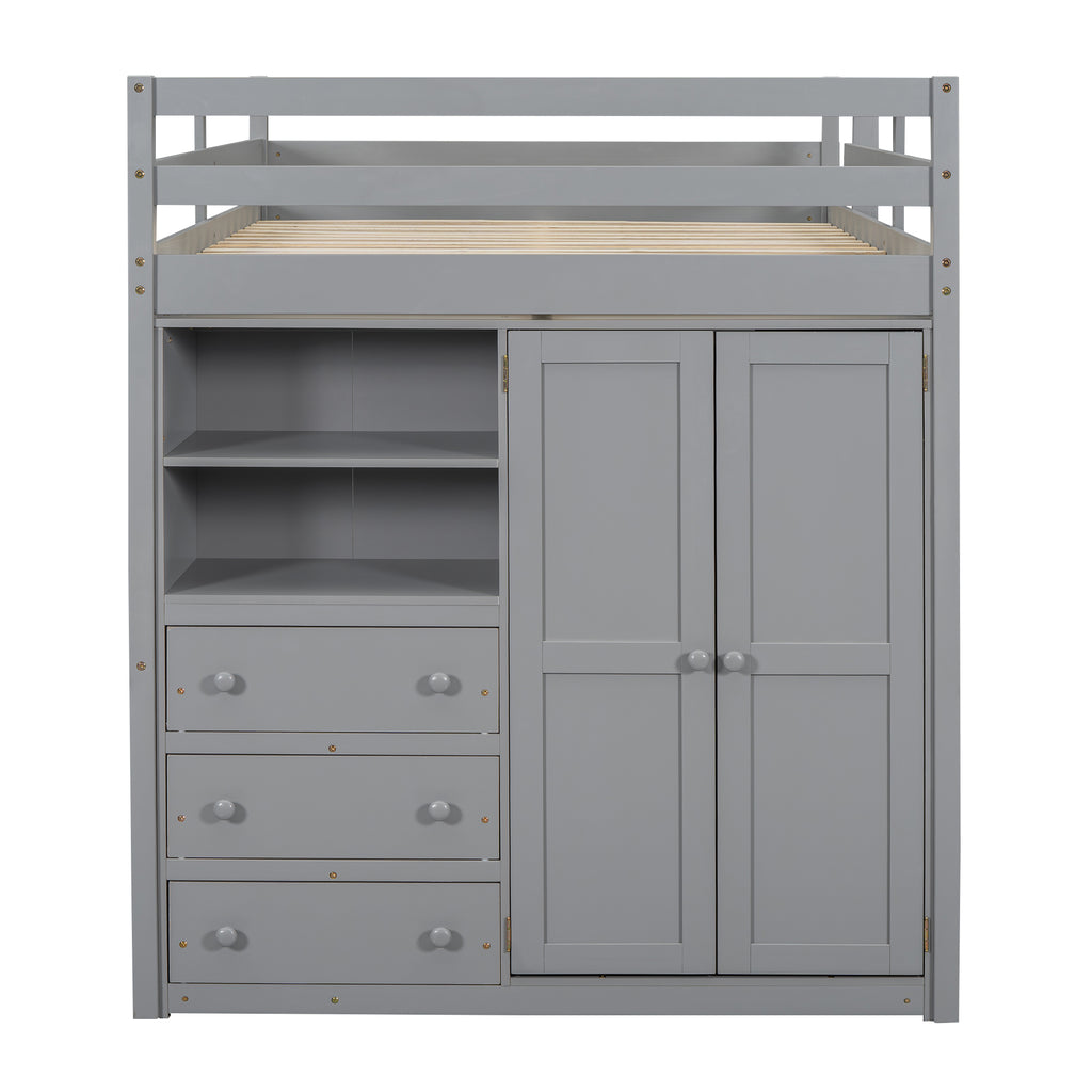 Maximize bedroom space with our Gray Full Size Loft Bed, featuring a built-in wardrobe, large storage drawers, and integrated desk – perfect for study or creative work. Crafted from durable wood, this versatile bed offers extensive organization for clothes, books, and essentials, keeping your room tidy and functional. Enjoy peace of mind with robust safety guardrails and a secure ladder, eliminating the need for a box spring while ensuring stability and lasting use.