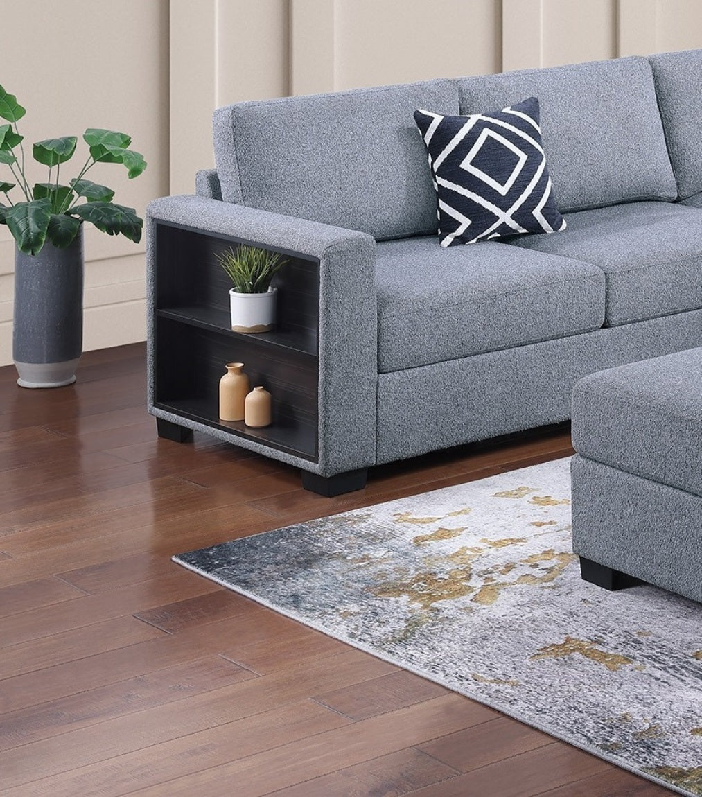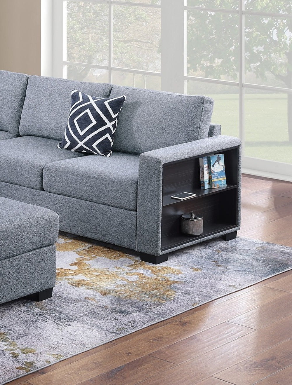 Whether you're unwinding after a long day or hosting a gathering, this 4-Piece Sectional Sofa with Cocktail Ottoman promises to elevate your living experience with comfort, style, and practicality. Perfectly crafted for both style and functionality, this L-shaped sectional is the epitome of contemporary living. Whether you're lounging solo or entertaining guests, this sectional provides the ideal balance of softness and resilience, with its plush pillows and firm cushions. The standout feature of this sectional is its versatility. Both arms are equipped with integrated shelves, providing convenient storage space for books, remote controls, or decorative accents. This innovative design ensures that your essentials are always within reach, making it a practical choice for any home. Included with the sectional are two accent pillows, elegantly enhancing the overall look with their complementary colors and textures. They not only add a touch of sophistication but also invite you to sink into the deep comfort of the sectional. Completing the set is a stylish cocktail ottoman, perfect for resting your feet or using as extra seating when needed. Its sleek design matches seamlessly with the sectional, creating a cohesive and inviting atmosphere in your living room.
