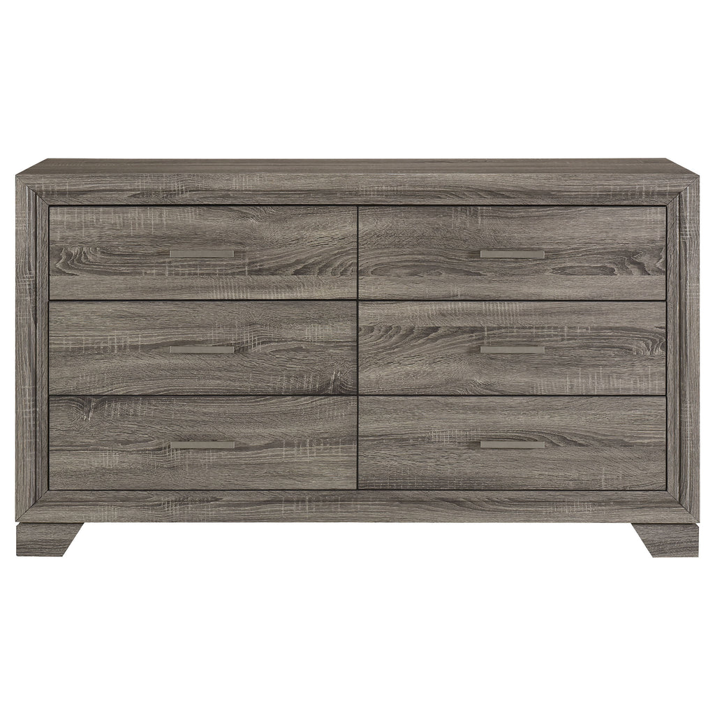 Outfit the room with this brown oak six-drawer dresser, a straightforward piece balancing a wide top for décor with smooth storage for jeans, tees, and accessories. Long metal pulls read modern against the grain, and the drawers open reliably to keep mornings moving.