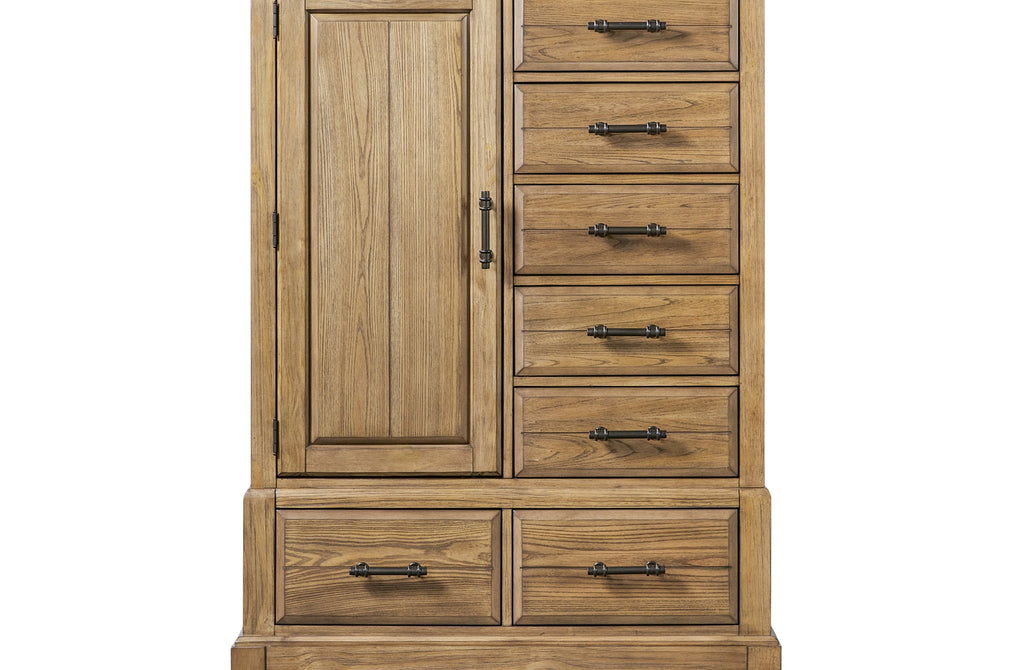 - The chest is designed with framed drawer and door fronts, creating visual dimension and highlighting the textured elm grain for a refined, tailored look