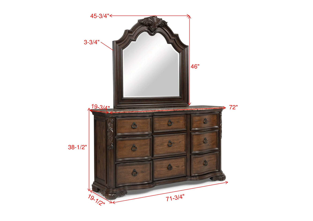 This formal Dresser features genuine marble top, intricate moldings, and beautifully curved silhouettes, enhancing both functionality and aesthetics. With its impeccable craftsmanship and stately presence, transforms any bedroom into a lavish retreat, offering a perfect blend of Old-World opulence and modern comfort.