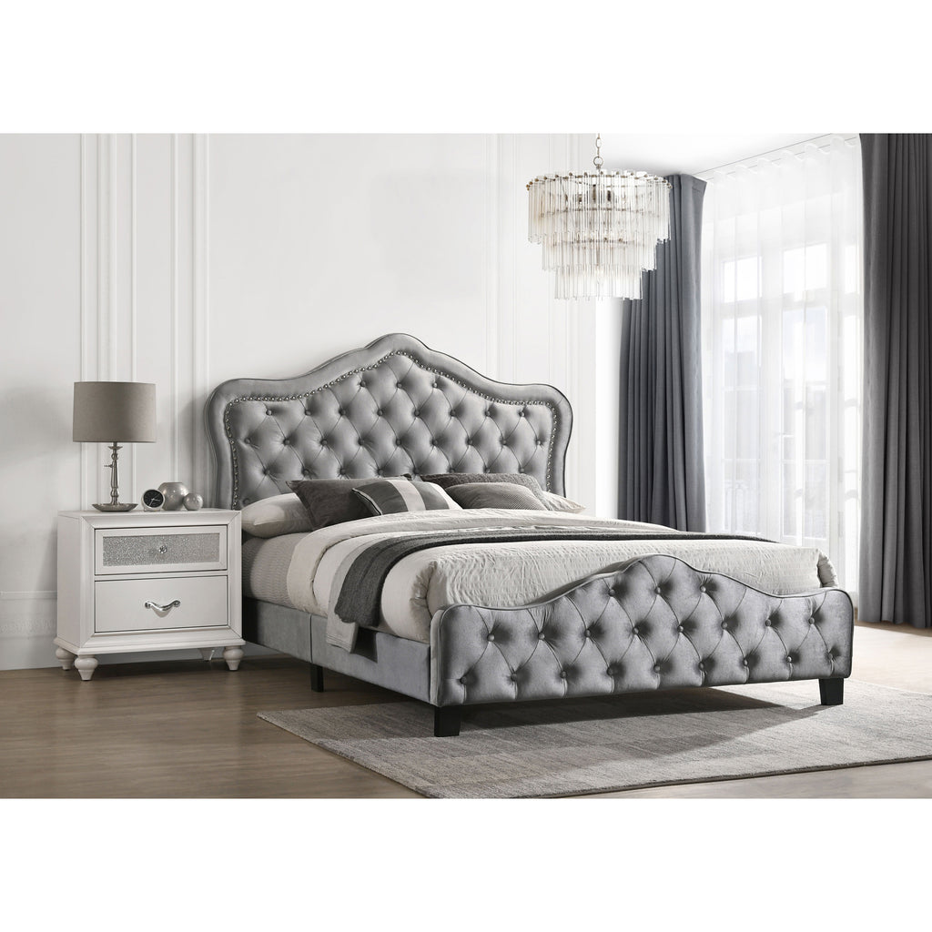 With an elegant, curvy silhouette along the bell-style headboard and footboard, this bed offers a dramatic and glamorous touch, elevated by a soft-to-the-touch grey velvet and its button tufting and shimmering chrome nailhead trim. With a neutral tone upholstery and black tapered legs, this bed works wonderfully within a master suite, lending a romantic vibe for practically any color palette.