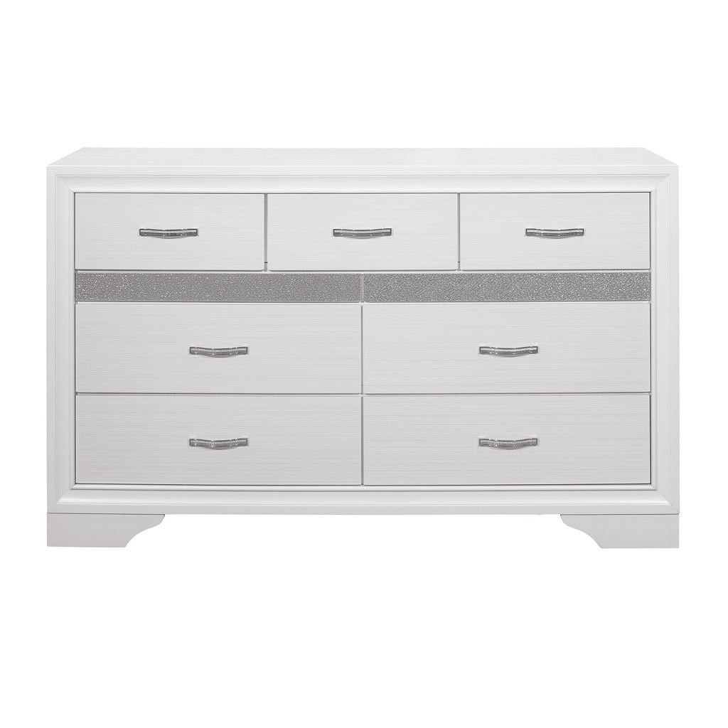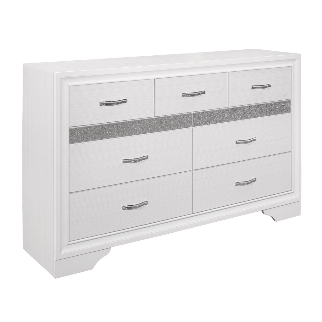 The unique styling of the Luster Collection presents a glamorous option for your bedroom. The dressers embossed faux-wood veneer features a white finish that allows for the acrylic silver glitter front of the hidden jewelry drawer to shine. The jewelry drawer features felt lining to protect your hidden items from wear and tear. Polished chrome bar drawer pulls front the drawers providing complementing contrast to the collections finish.