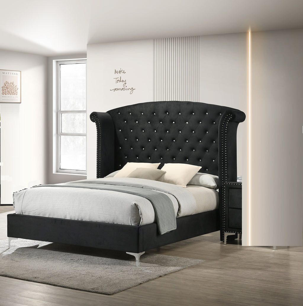 Immerse yourself in the regal charm of this majestic bedroom collection, a true embodiment of luxurious comfort and refined elegance. At the heart lies a bed that commands attention with its impressive wingback headboard, richly upholstered in a rich velvet and adorned with diamond tufting and shining nailhead trim, offering a sophisticated centerpiece.