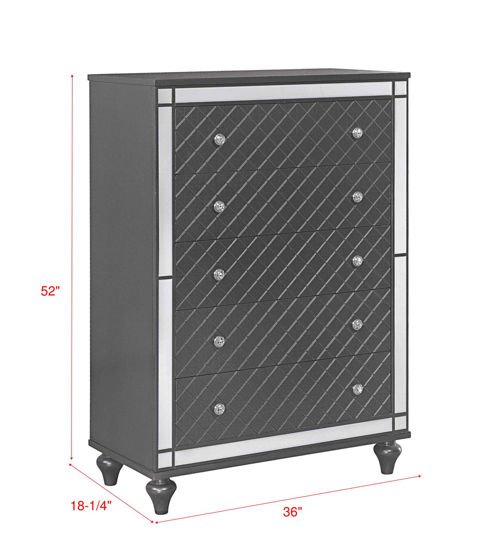 Spice up your bedroom with this glamorous chest. Indulge in the elegant style of the shining mirror plating contrasting with the dark finish. The thin line pattern and faux crystal drawer knobs add extra depth and intrigue to the piece. Use the five drawers to store your personal items away so that clutter doesn't distract from this sparkling chest.