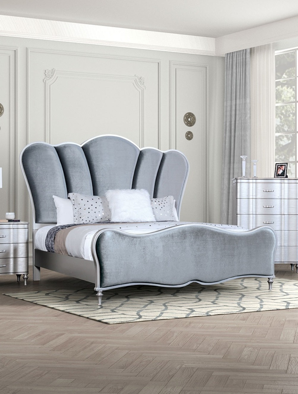 Glam Silver Fabric, Solid Wood, Others Padded Channel Headboard Turned Wood Leg. Upholstery Color - Light Gray