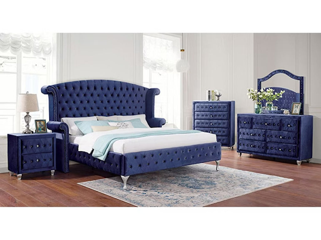 Comforting cushioned flannelette encompasses this chic bedroom set. Admire the glamorous wing-back headboard as glimmering acrylic button tufts and a framing nailhead trim dazzle your senses. Run your hands over the soothing case goods and easily stock essentials in their cavernous storage drawers. Cabriole feet add a well polished finished as they provide unwavering support to this elegant bedroom set.