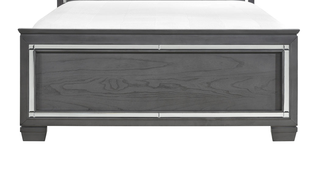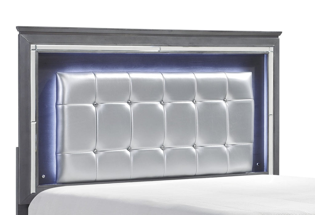 Glamour reigns in the design of the Allura Collection. Framing the Queen bed is a decorative beveled mirror accent that enhances the illumination from the touch-engaged LED backlight of the headboard. High polished crystal-enhanced hardware boldly accents the gray finish as does the gray faux leather crystal-tufted headboard insert.