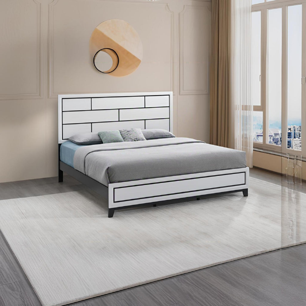 - White laminate finish with wood-grain texture and bold black accents for dramatic, modern appeal.