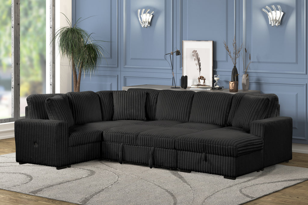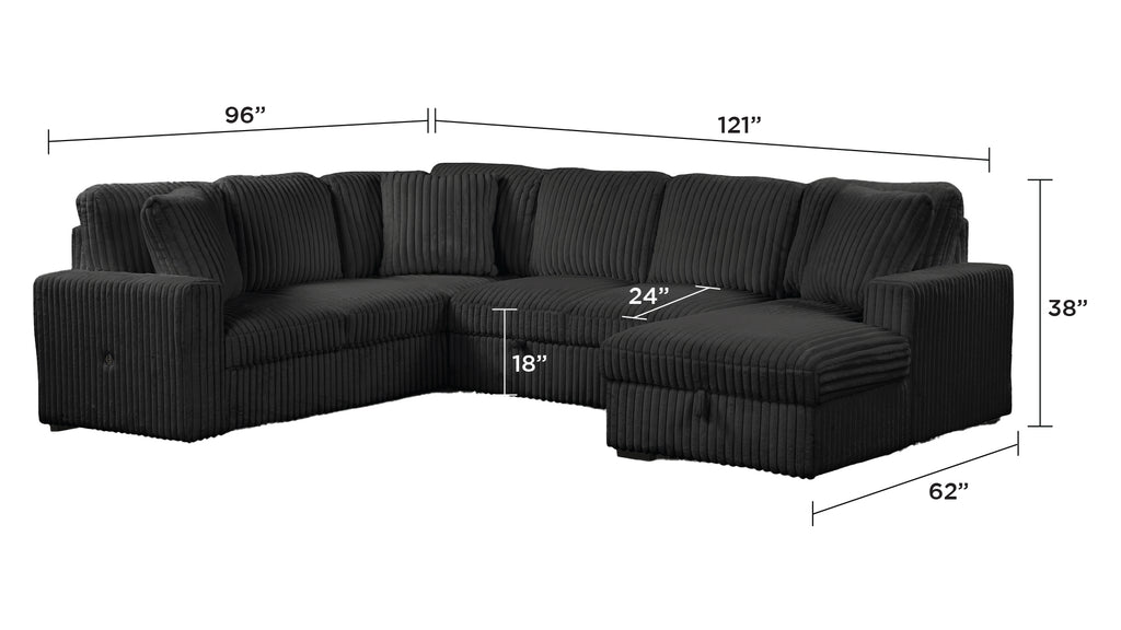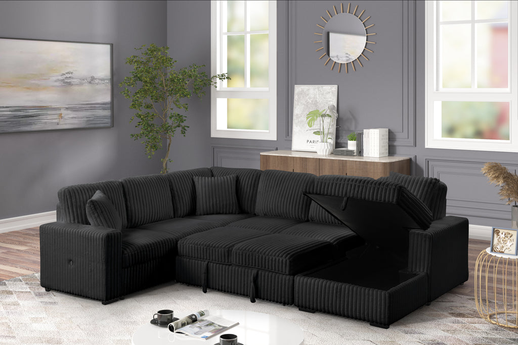 This luxurious sectional sofa combines style and functionality to transform your living room into a space of comfort and elegance. Designed with plush seating and a sleek, modern aesthetic, it offers the ultimate lounging experience during the day and easily converts into a cozy bed for the night with its integrated sleeper function. The chaise is equipped with convenient built-in storage, perfect for keeping your essentials organized and out of sight. With USB ports incorporated into the design, you can stay connected and charge your devices with ease. Available in sophisticated colors like Cream, Gray, and Black, this sectional complements various interior styles and adds a touch of luxury to any space.
