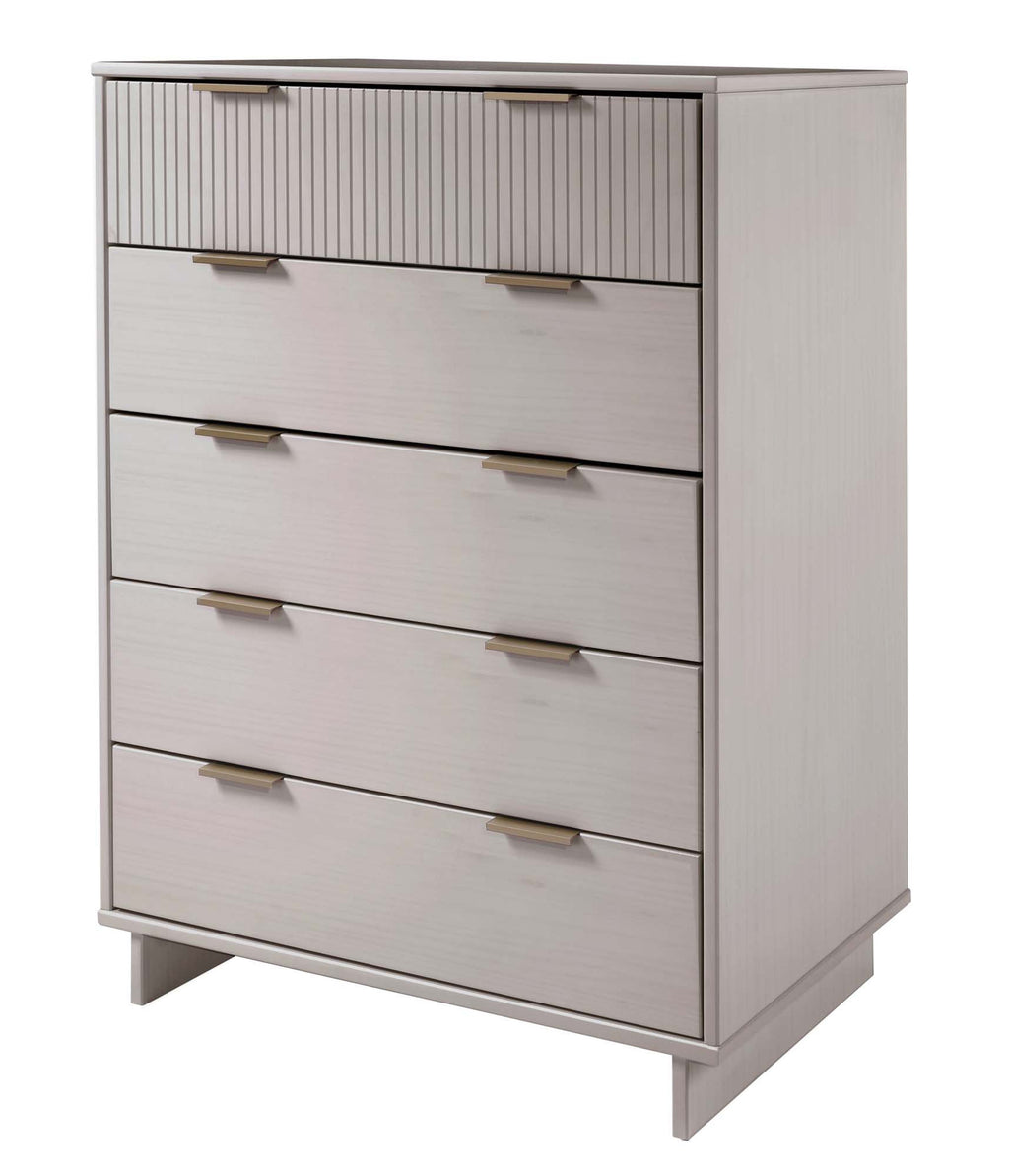 - Includes 5 Full Extension Drawers with Top Drawer Designed in Vertical Textured Ribbed Lines Made from Solid Wood.