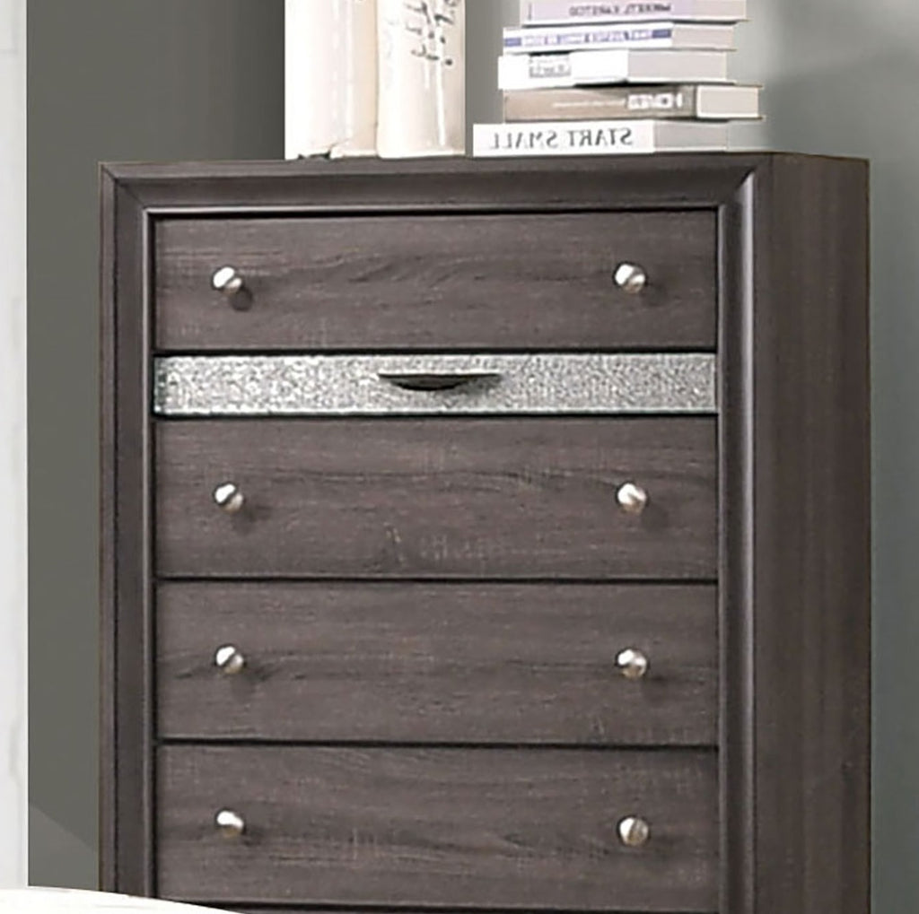 Brighten your room with the sheen and shine that this chest delivers. The gleaming finish promotes a refreshing clean aesthetic with silver lines that glisten. Silver tone pulls detail the case goods brilliantly, offering an easy grasp to the one-of-a-kind jewelry drawers. Glimmering and glamorous, create the room you have always dreamed of.