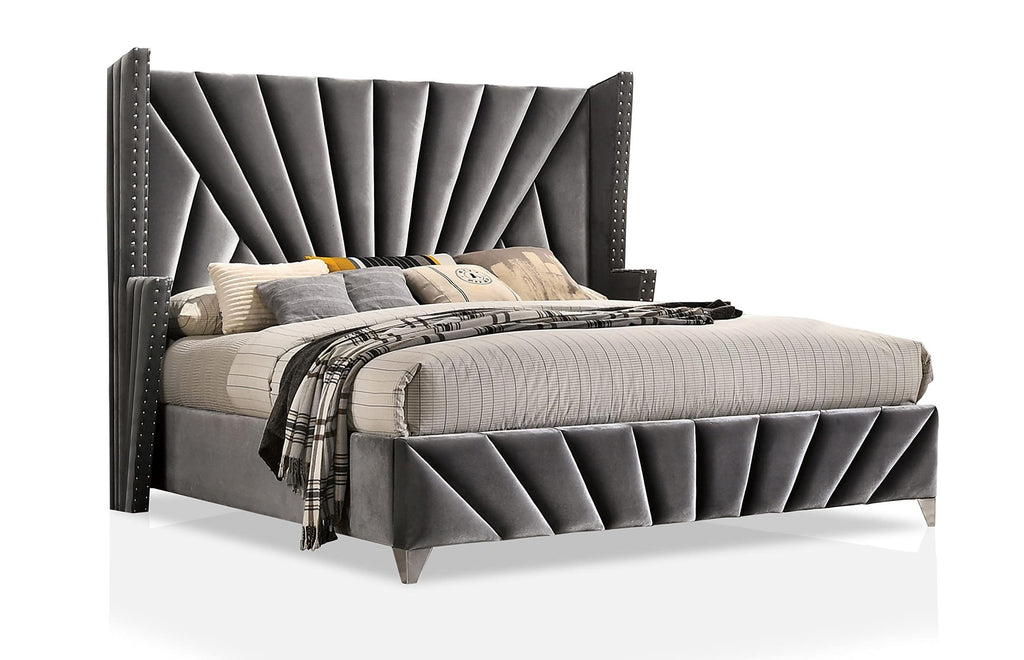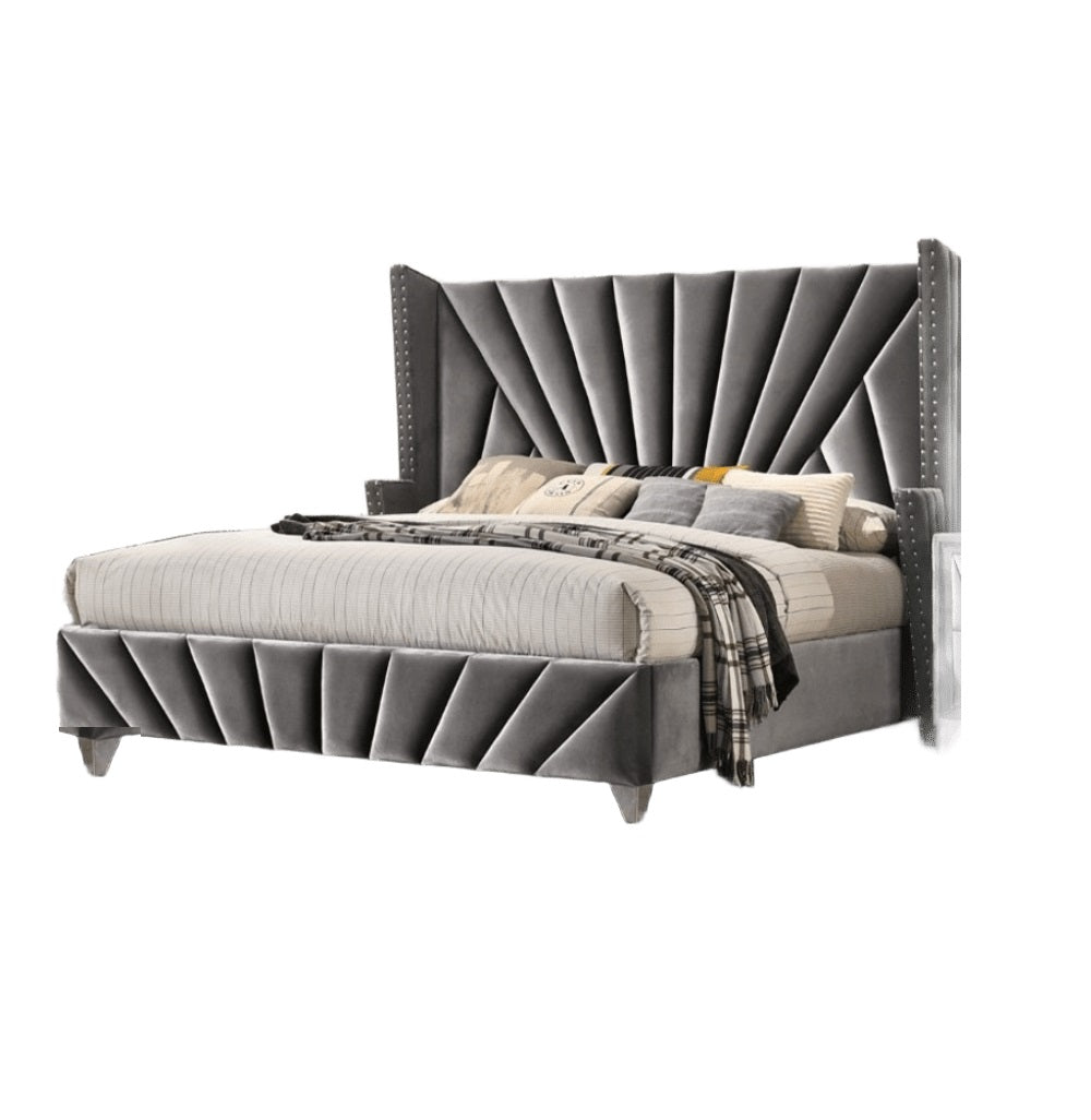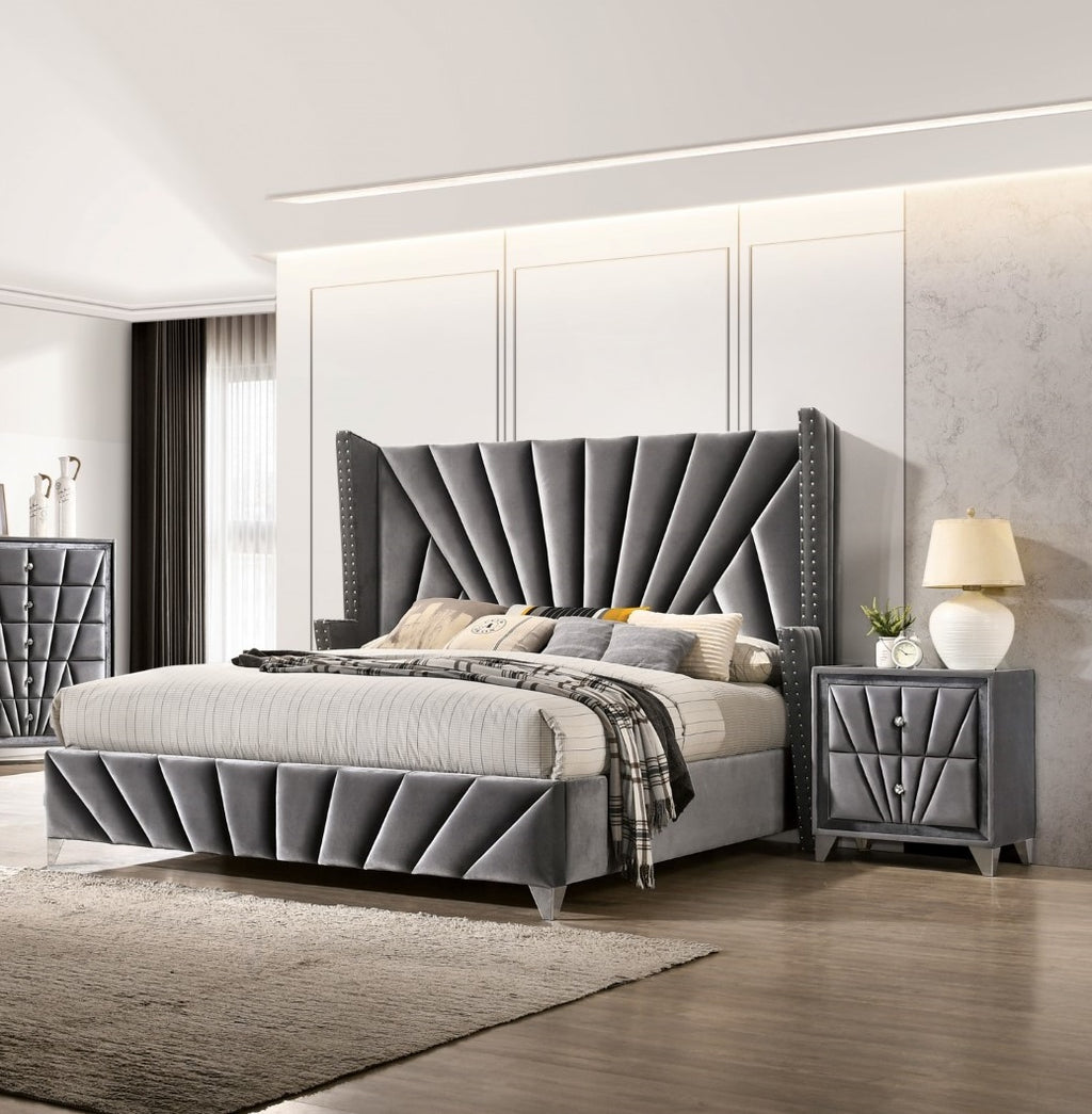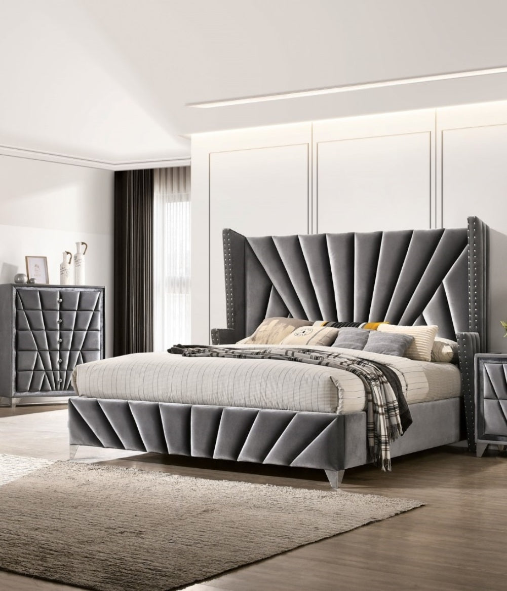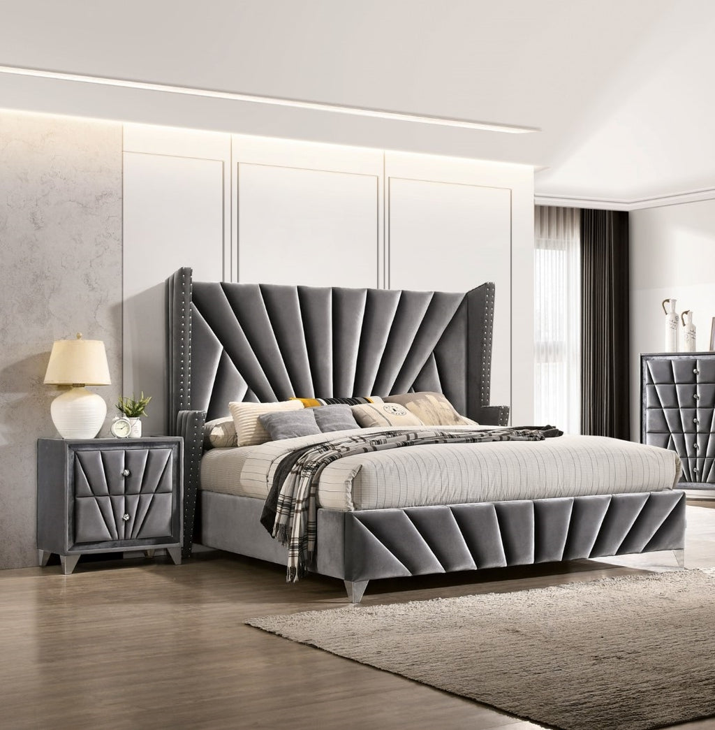 The ultimate Art Deco-inspired bedroom set! The elegance, the glamour, the unique shapes and vintage appeal of 1930’s Hollywood is right here! The decadent gray velvet upholstery looks like it came right out of a classic RKO black & white film! Whether you fancy yourself the dashing leading man or the stunning starlet, prestige awaits you with this unique design assembly that seems to capture all of the excitement of a massive movie premiere! Chrome feet provide the support while additional embellishments such as nailhead trim and diamond ring drawer pulls faithfully enhance this cinematic reality.