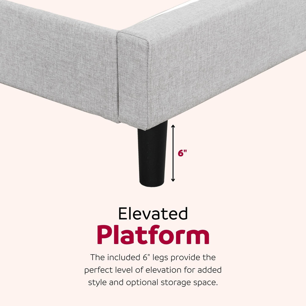 This Upholstered Platform Bed is a solid choice to elevate your bedroom style. Its modern minimalist foam padded headboard makes for an ideal centerpiece in any modern or contemporary home décor. Rest easy knowing this platform bed is constructed with solid wood and plywood frame to ensure reliable mattress support, stability and durability. It's chic grey linen fabric and streamlined design makes it an excellent addition to any bedroom and one you will enjoy for years to come.