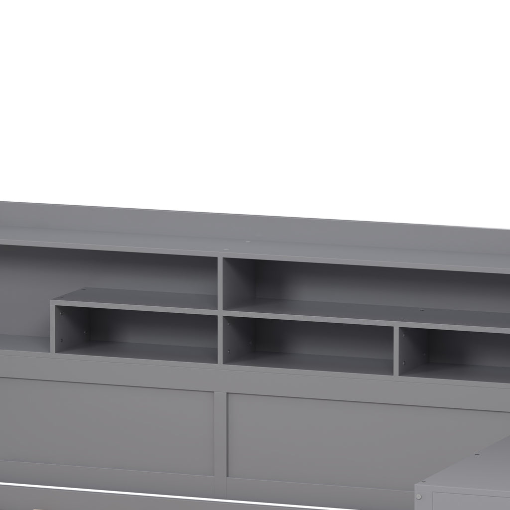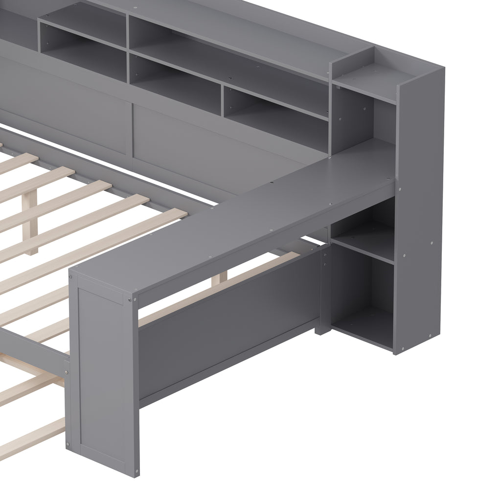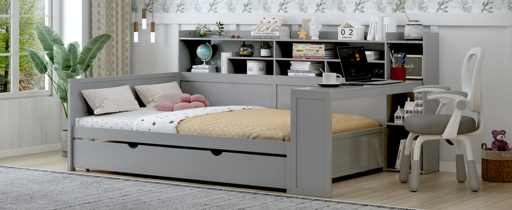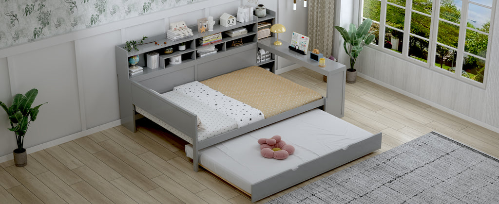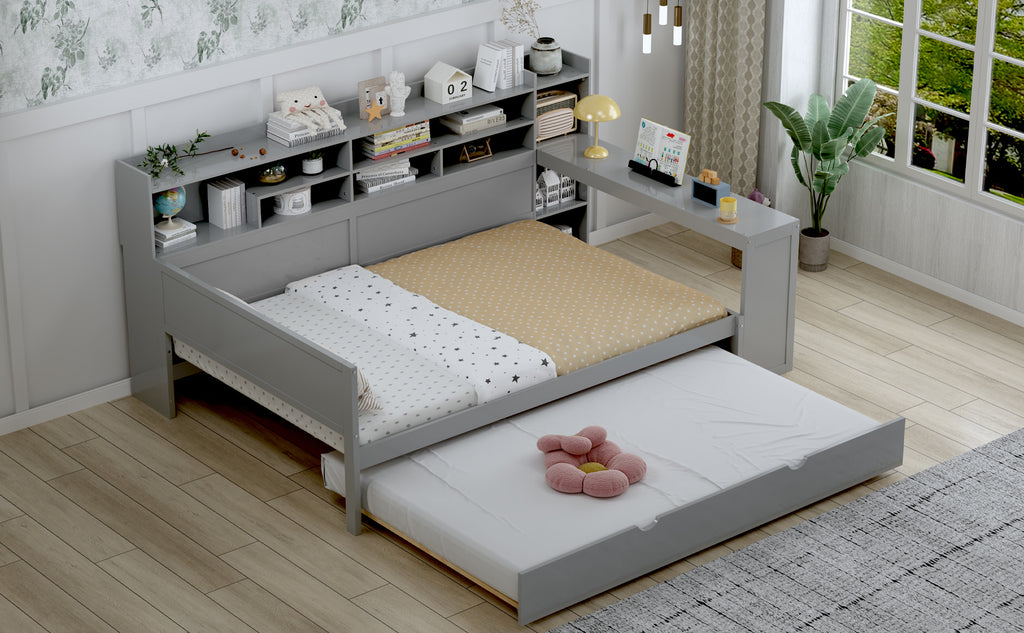 Maximize space with this Gray Full-Size Wooden Daybed, featuring a twin trundle, integrated study desk, and multi-layer storage. Crafted from high-quality MDF, Plywood, and Pine, this versatile bed offers superior durability and smart organization solutions. Perfect for any bedroom, it combines functionality and modern aesthetics to enhance productivity and comfort.