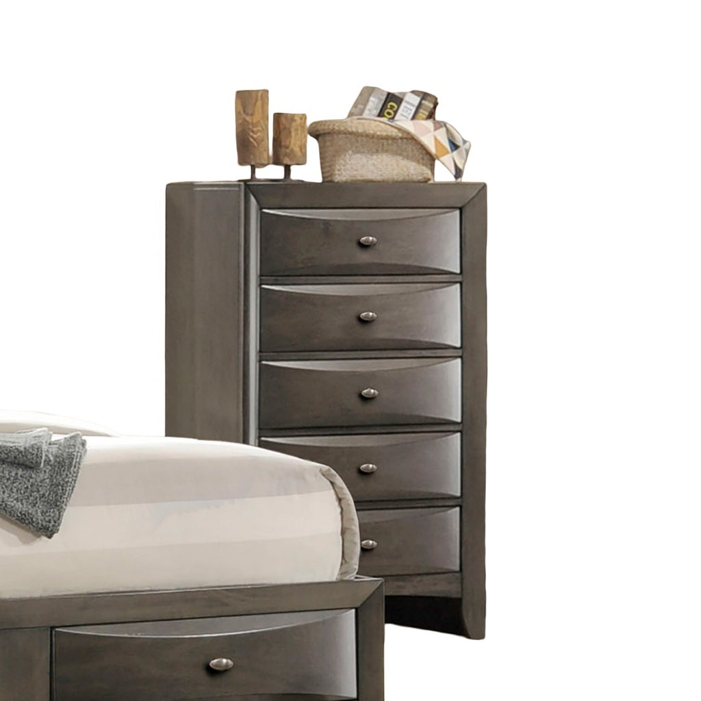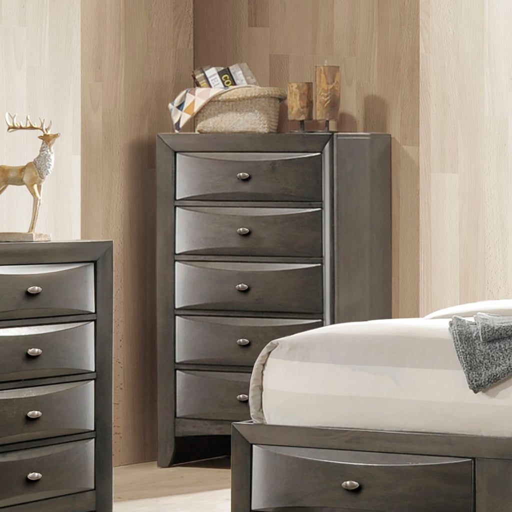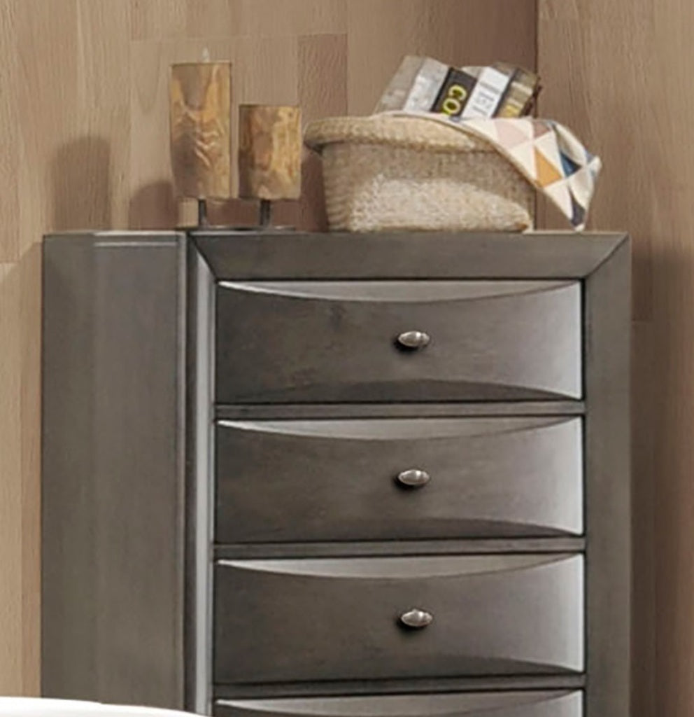 A transitional design in a soft gray finish ideal if you're aiming for a blend of modern and classic aesthetics. Constructed using a combination of engineered wood, solid wood, and other materials, providing both durability and refined craftsmanship. Features smooth nickel oval knob hardware, adding a subtle yet elegant metallic accent to the chest.