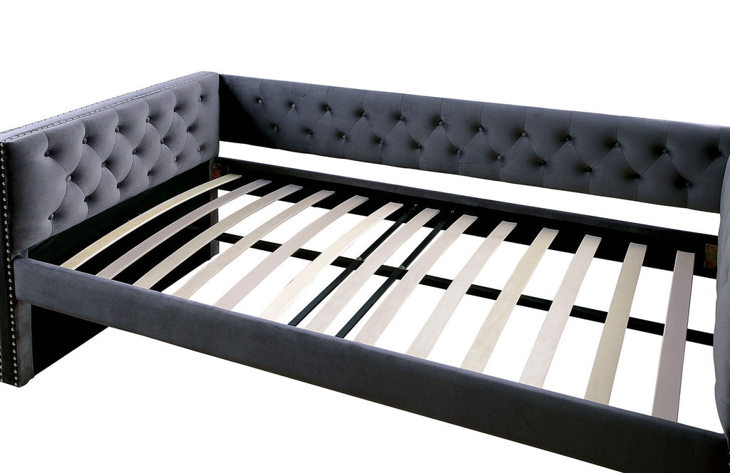 The rigidity of the tuxedo design offers an alluring base for a daybed. A softer button tufting encases the entirety of this piece, from outside arms to back rest, highlighted by a twin nailhead trim running along the length of the frame. Combine with some throw pillows to add depth and extra comfort. Should the need arise for extra bedding; a pull out trundle can accommodate your needs.