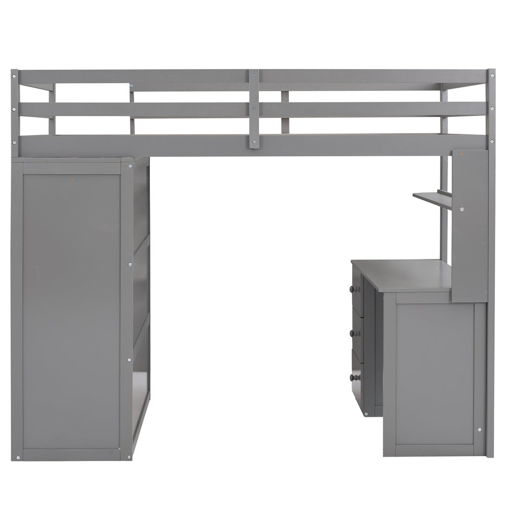 Maximize your space with this versatile Gray Solid Wood Twin Loft Bed, featuring an integrated desk, drawers, and wardrobe for ultimate organization. Crafted from durable pine wood and MDF, it offers a secure and comfortable sleeping environment for growing families. This multi-functional design perfectly combines study, storage, and sleep, making it an ideal choice for compact living.