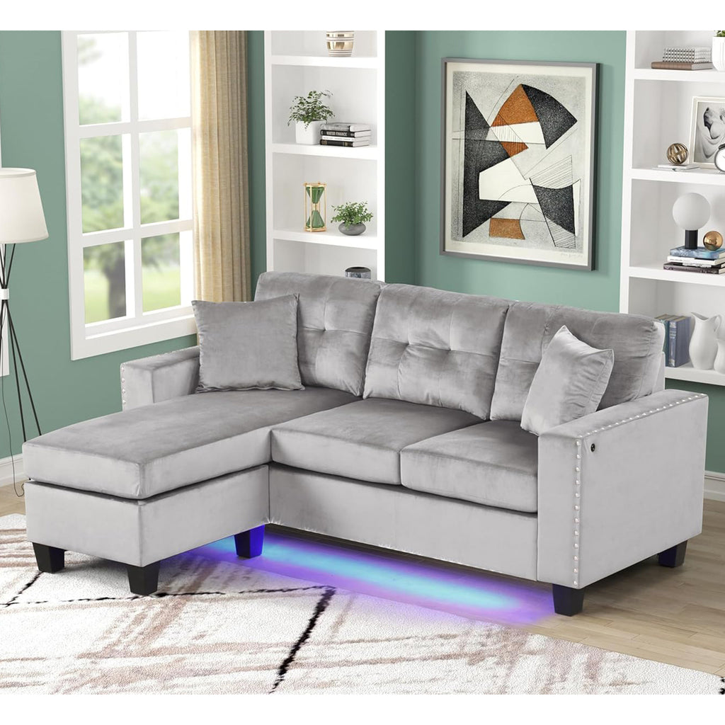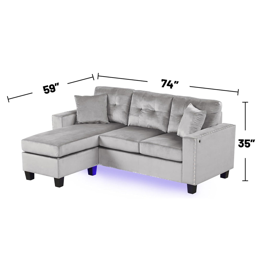 The sectional sofa chaise combines luxury and functionality, making it the perfect addition to any modern living space. With its built-in LED lights, you can set the perfect ambiance for relaxation or entertainment. The elegant nailhead trim adds a refined touch, while the tufted cushions offer ultimate comfort. Complete with matching throw pillows, this sectional provides both style and cozy seating for your home.