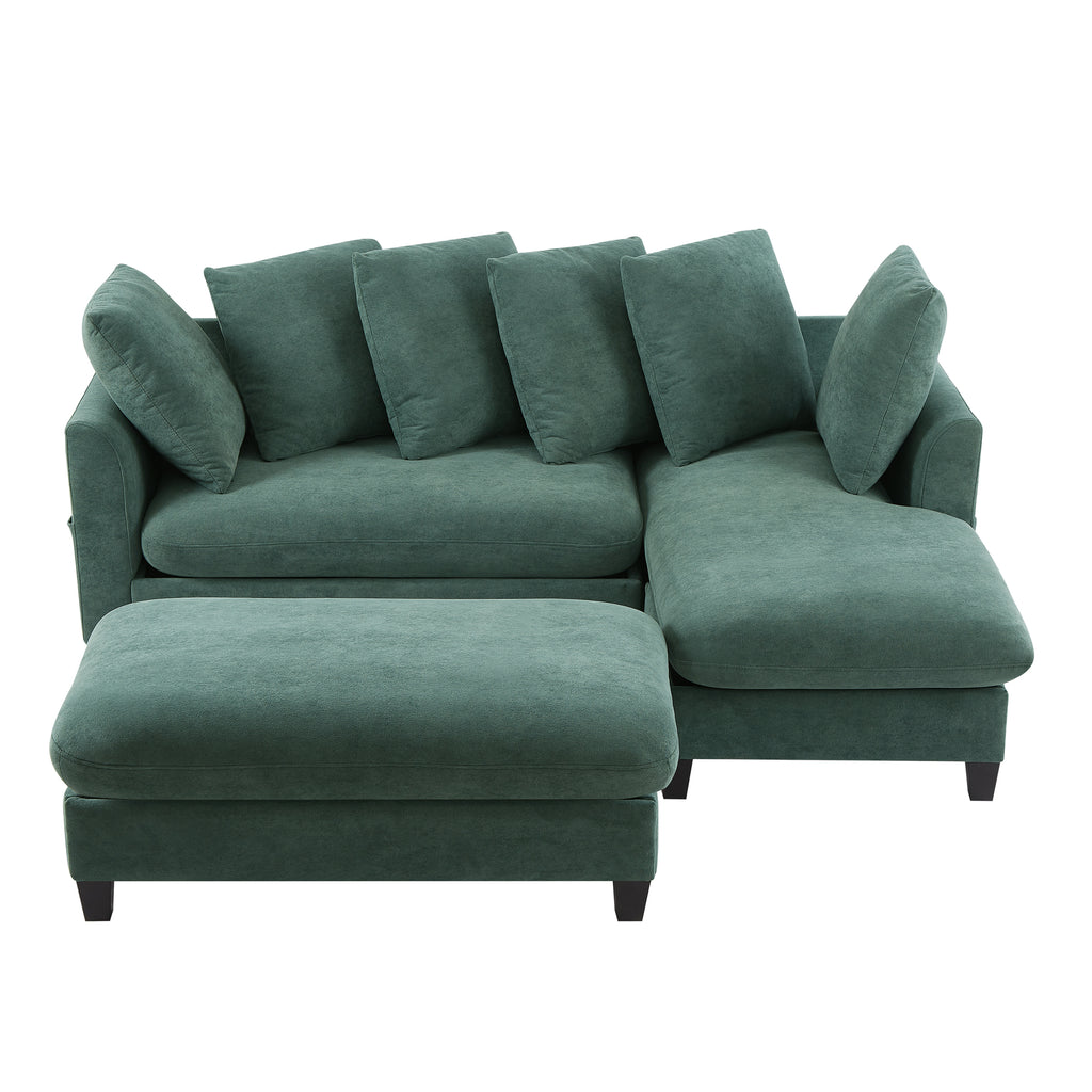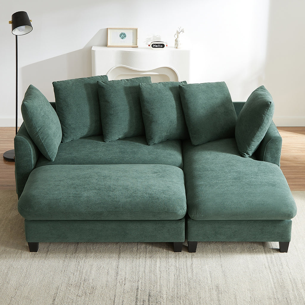 This versatile sofa is designed for both comfort and functionality, featuring ample hidden storage beneath the seats for easy organization. The movable ottoman can transform into a spacious bed when combined with the sofa, or serve as a cozy footrest or stylish coffee table when used separately. Convenient side storage pockets keep everyday essentials within reach, while six soft throw pillows add extra comfort and style. The sofa’s ergonomically curved armrests provide optimal support, and the premium chenille upholstery offers a luxurious, durable, and easy-to-maintain fabric. Ideal for modern living spaces, this sofa combines practicality with elegance.