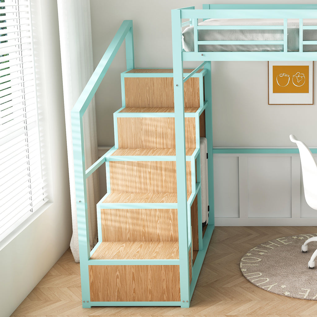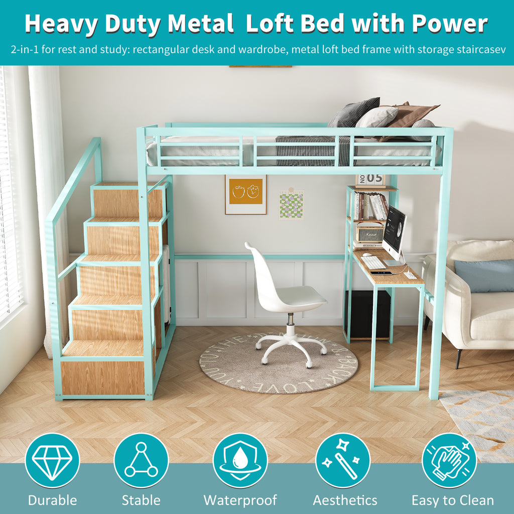- 【Space-Saving Loft Bed & Workspace】 :This full-size loft bed features a sturdy staircase and a spacious built-in workstation with a bookshelf, plus two-tier shelving underneath for ample storage—perfect for creating a cozy and organized office space