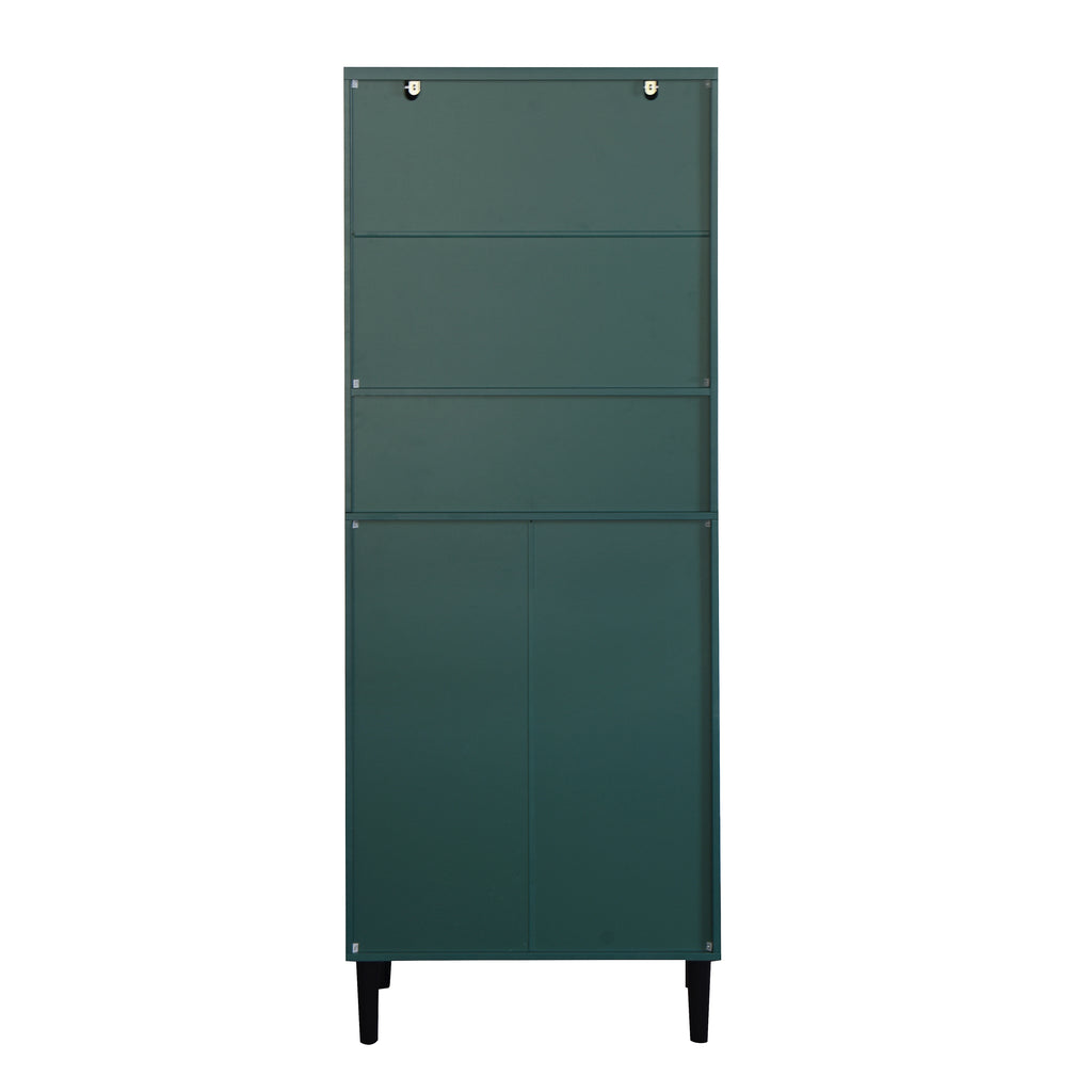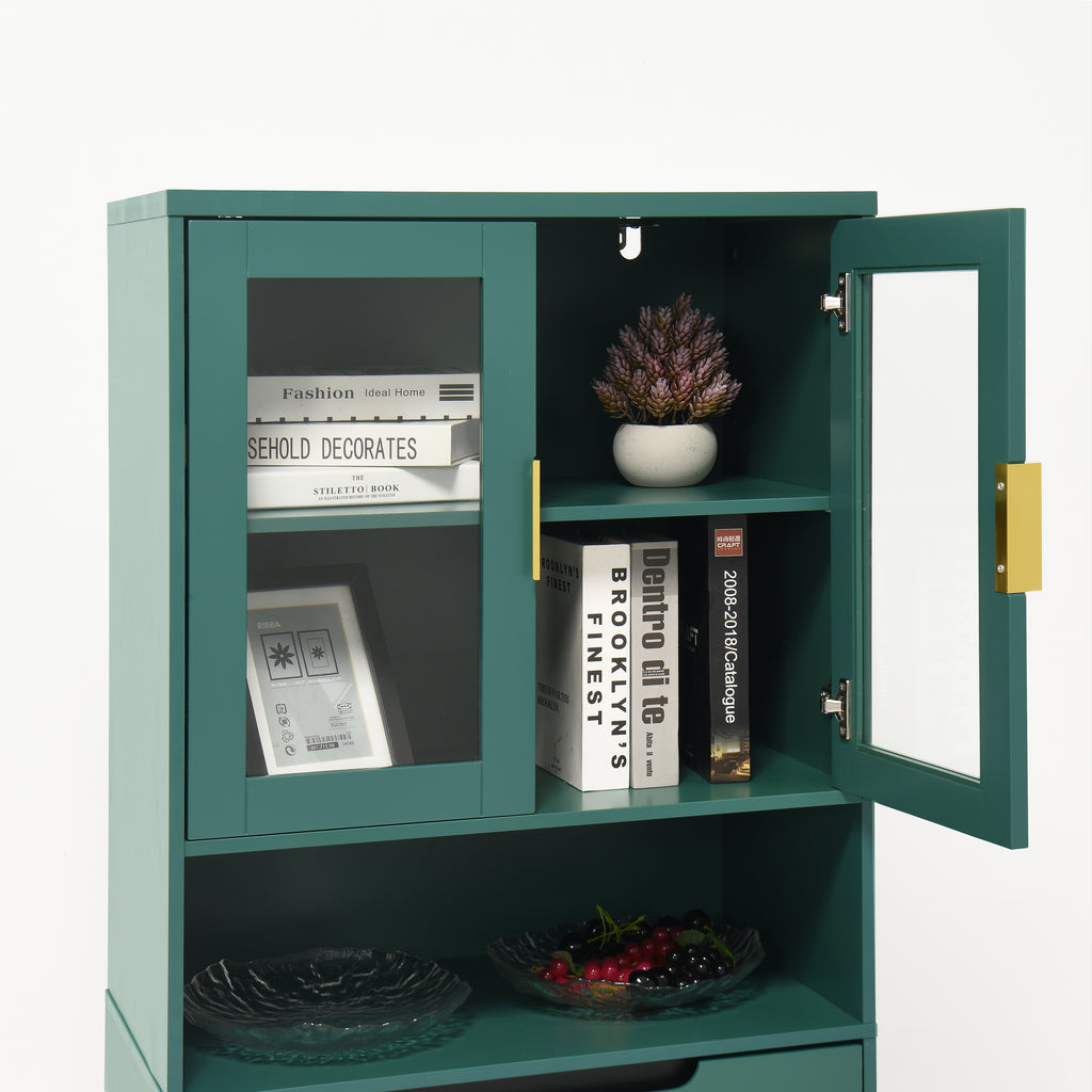 - With its elegant yet chic appearance and classified practical design, this green cabinet is suitable for various places: living room, kitchen pantry, bathroom, office, entryway, or any corner, even as buffet cabinet at dining room. Moreover, the top storage cabinet is equipped with two glass doors, allowing it to be used as a filing cabinet, display cabinet, or bookcase in a home office.
