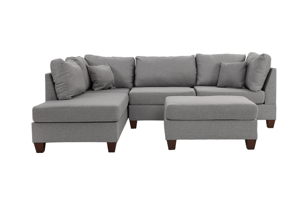 Experience simplicity with this 3-piece sectional with a matching ottoman. Upholstered in a plush linen-like fabric, this sectional features cushioned pillow back and seat supports for maximum comfort, and works perfect in a contemporary or classic styled living room. Available in sand, , and chocolate.